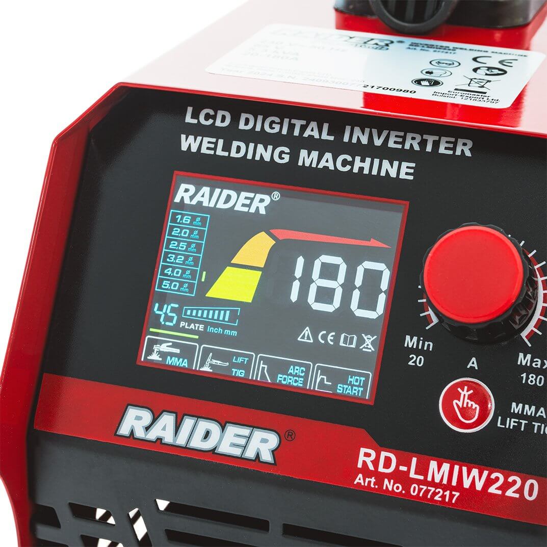 Aparat de sudură invertor Raider RD-LMIW220 180 A, MMA, 230 V, LCD, electrozi 1,6–5 mm, IP21S — un invertor compact pentru sudură manuală cu arc electric (MMA), conceput pentru sarcini uzuale acasă, în garaj, atelier sau pe șantier. Practic atunci când este necesară o cusătură uniformă fără reglaje complicate: setați curentul, îl monitorizați pe afișajul LCD și începeți lucrul.