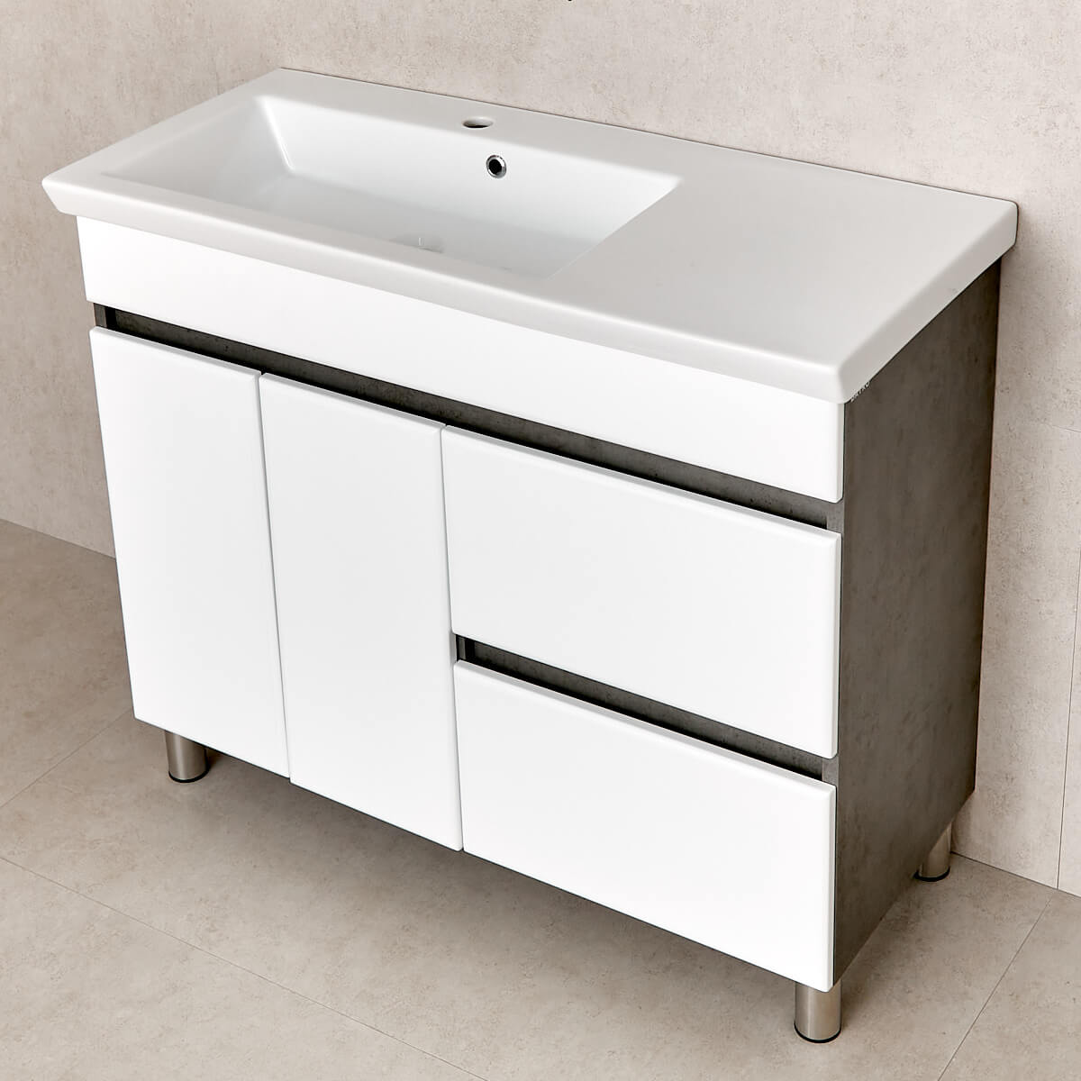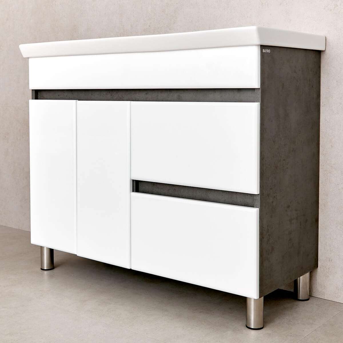 Dulap sub lavoar BAYRO Urbano Pro 970x402x810 mm beton Chicago închis — o soluție modernă pentru amenajarea băii, care combină un design minimalist cu funcționalitate ridicată. Modelul din colecția Urbano Pro este realizat într-o combinație elegantă de fronturi albe și corp cu finisaj beton Chicago, adăugând un accent industrial contemporan în interior.