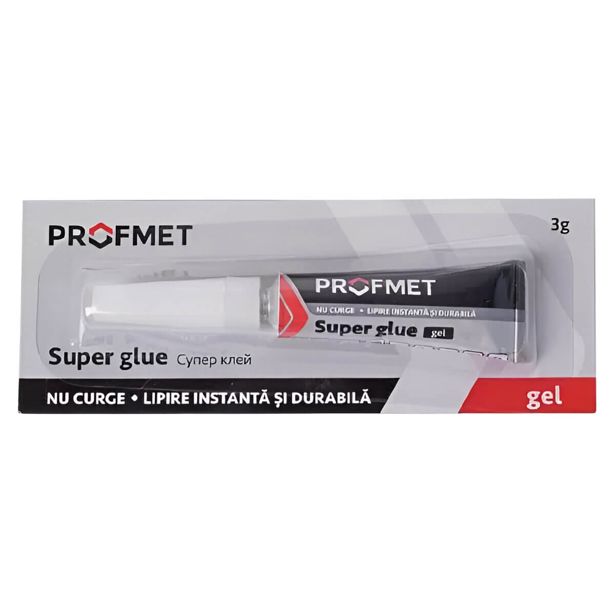 Super clei gel PROFMET 3 g (art. 745302) — un adeziv gel compact pentru reparații rapide de uz casnic, atunci când este nevoie de „se fixează și ține”, nu de „curge și se lipește de degete”. Consistența gel permite aplicarea precisă și controlată, inclusiv pe piese mici.