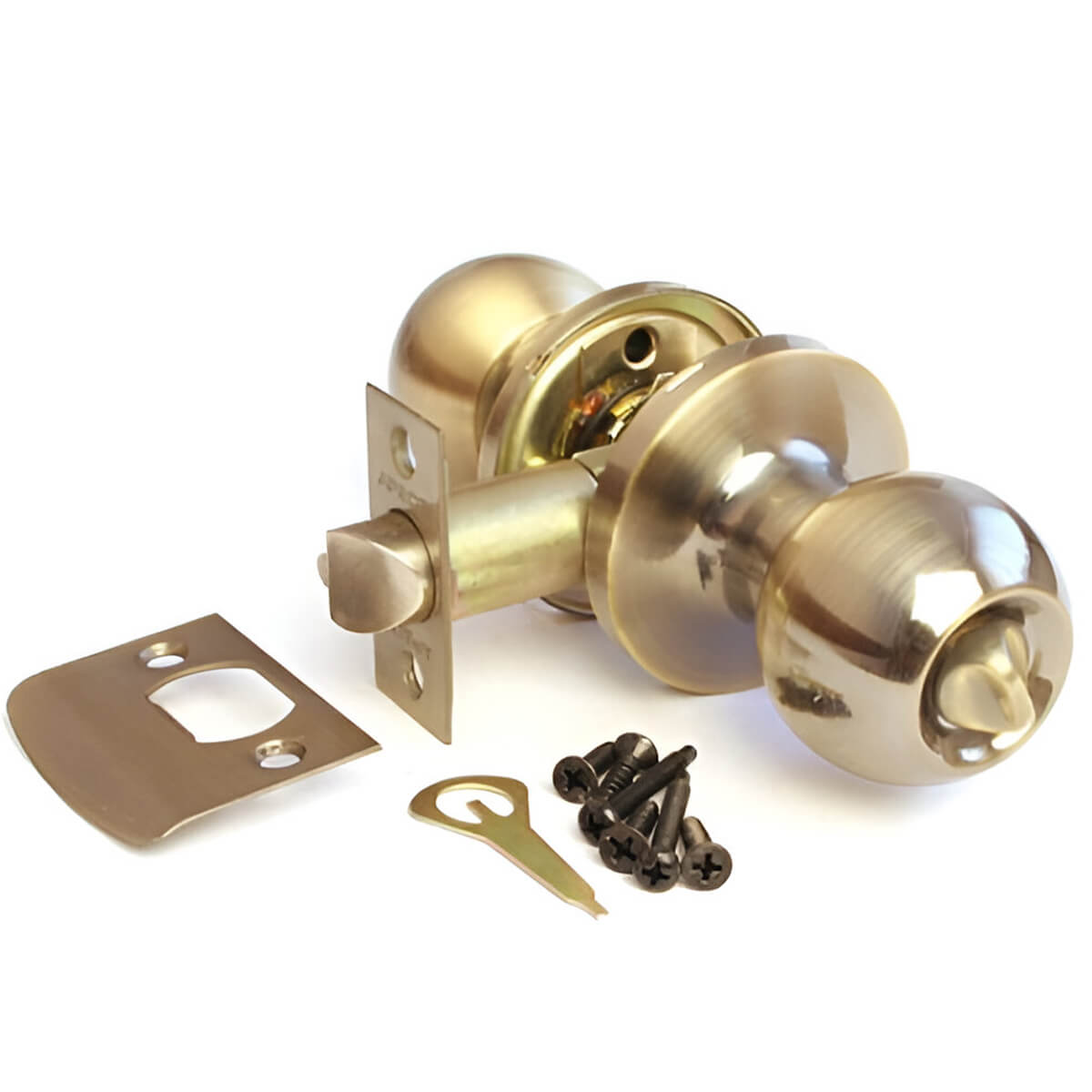 Mâner buton (knob) AVERS 6072-03-AB WC cu blocare, bronz antic, 35-45 mm, 60-70 mm — o soluție compactă pentru ușile interioare de baie și toaletă, unde este necesar acces facil din exterior și intimitate comodă din interior. Knobul combină mânerul, zăvorul și butonul rotativ de blocare într-un singur corp, astfel încât ușa se închide ordonat, fără feronerie suplimentară.