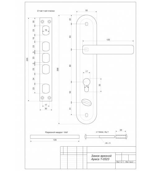 Carcasa broaștei se montează printr-o placă frontală galvanizată cu finisaj din bronz antic, rezistentă la coroziune și uzură. Broasca are o configurație pentru deschidere stânga, cu zăvor clasic și distanță interaxială de 80 mm. Backset-ul (distanța până la gaura cheii) este de 60 mm. Închiderea din interior este posibilă printr-un mecanism rotativ.