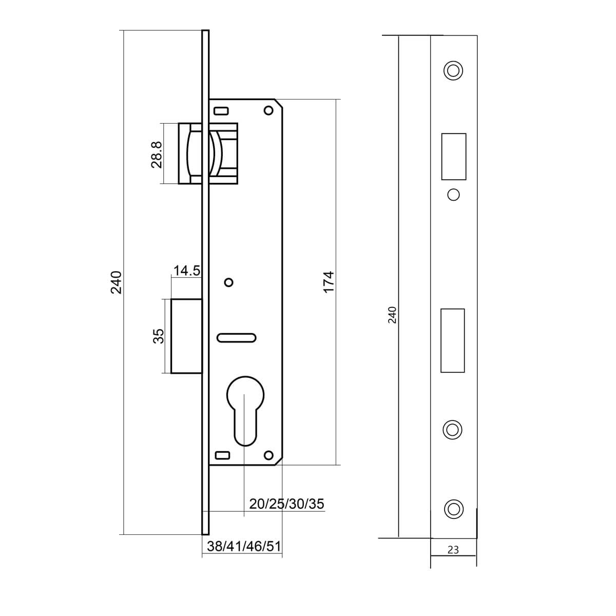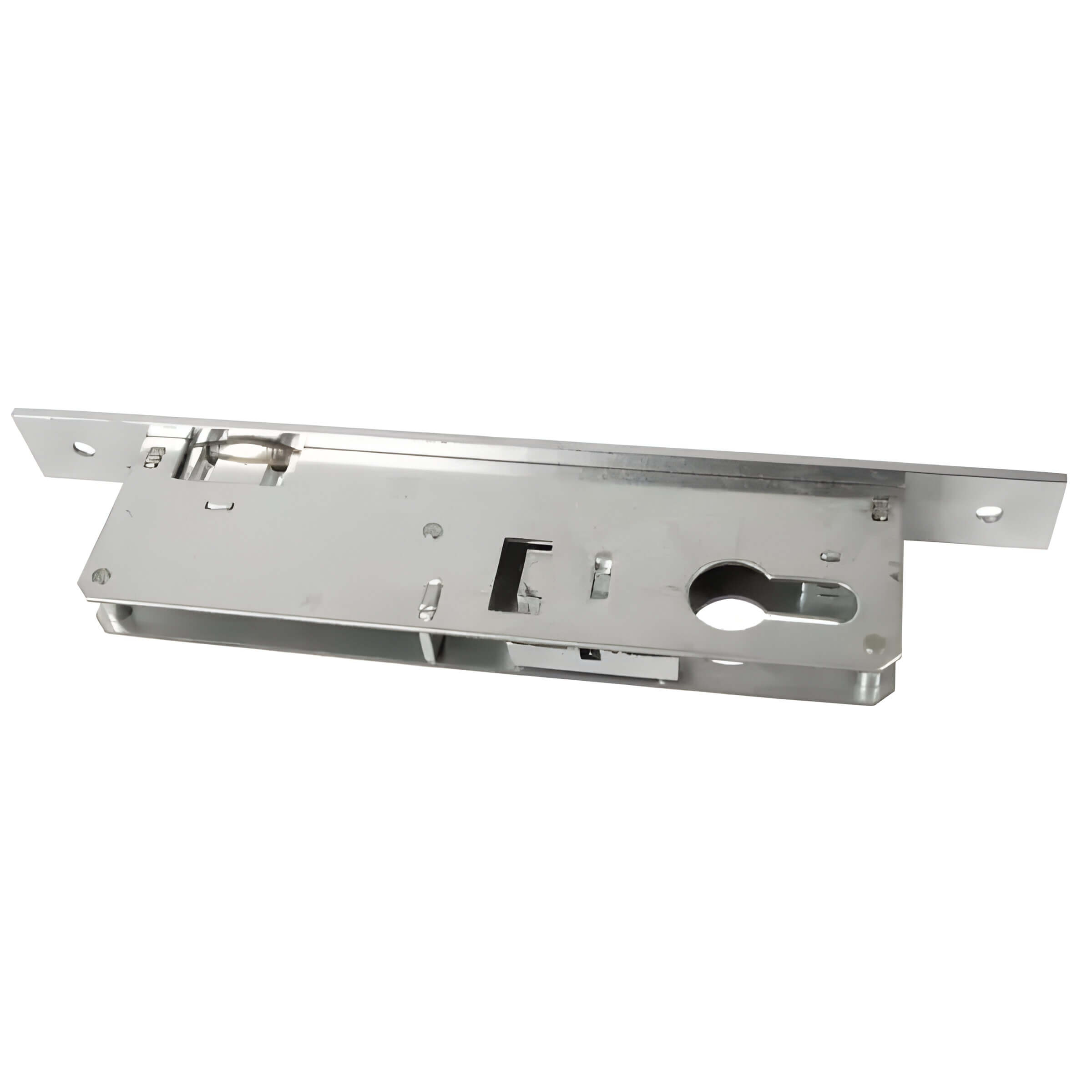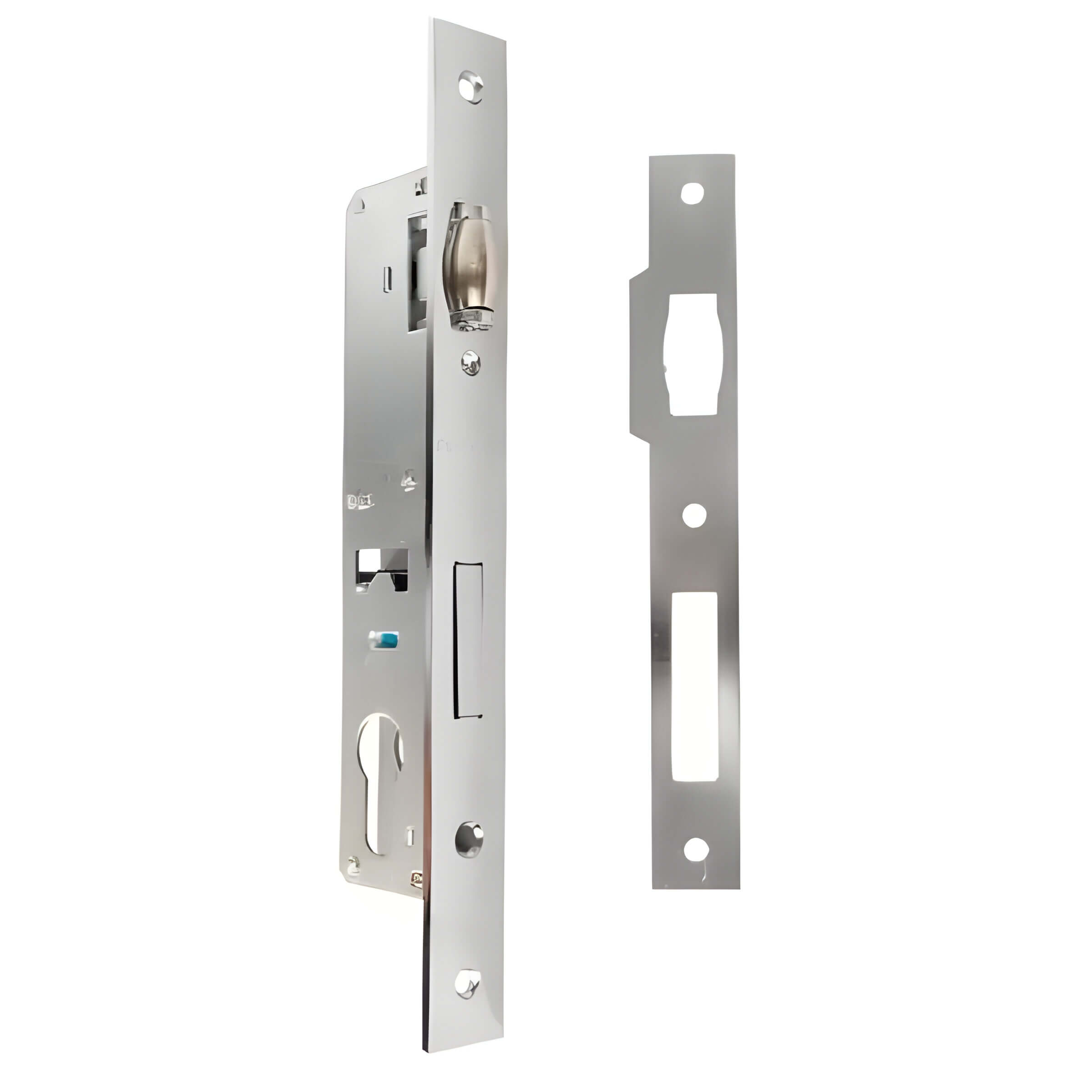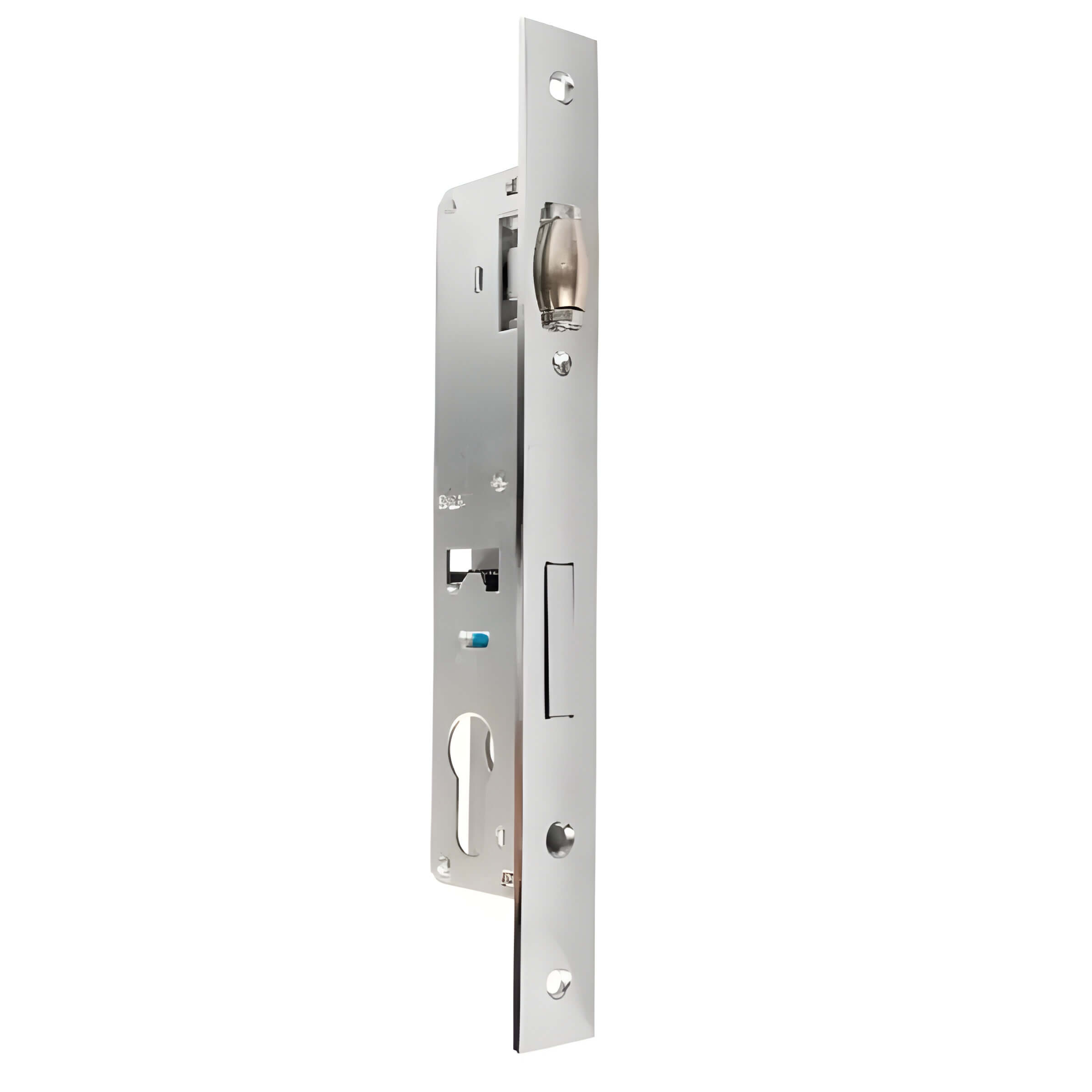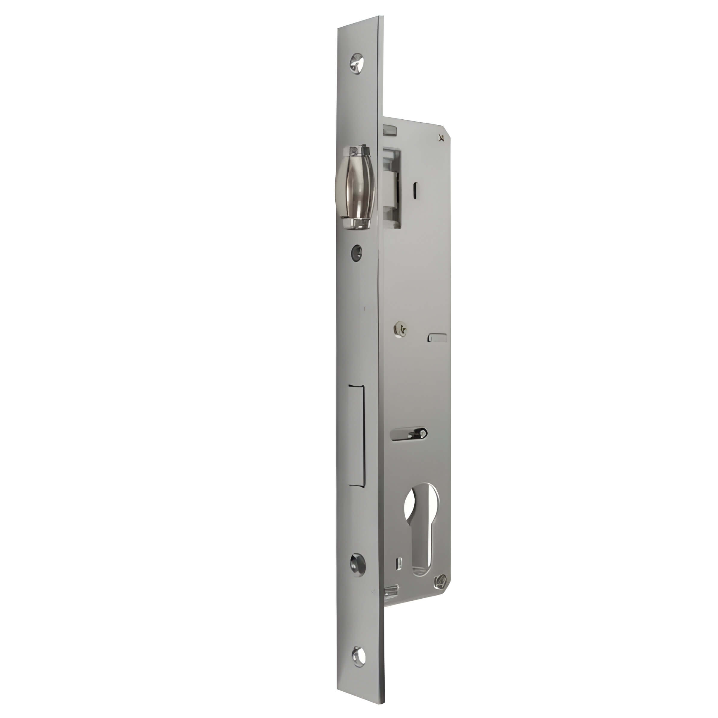 Broască îngropată cu profil îngust PROFMET cu zăvor sub cilindru pentru uși din PVC și aluminiu, backset 35 mm, interax 85 mm, nichel — o soluție practică pentru construcțiile profilate, unde este importantă montarea precisă și funcționarea stabilă a feroneriei. Mecanismul este proiectat pentru utilizare zilnică și oferă o închidere fiabilă, fără smucituri sau devieri.