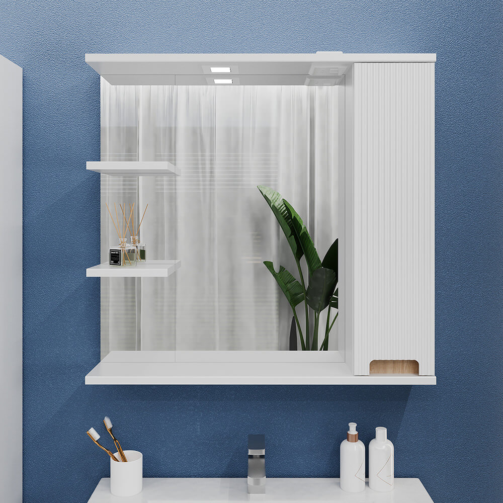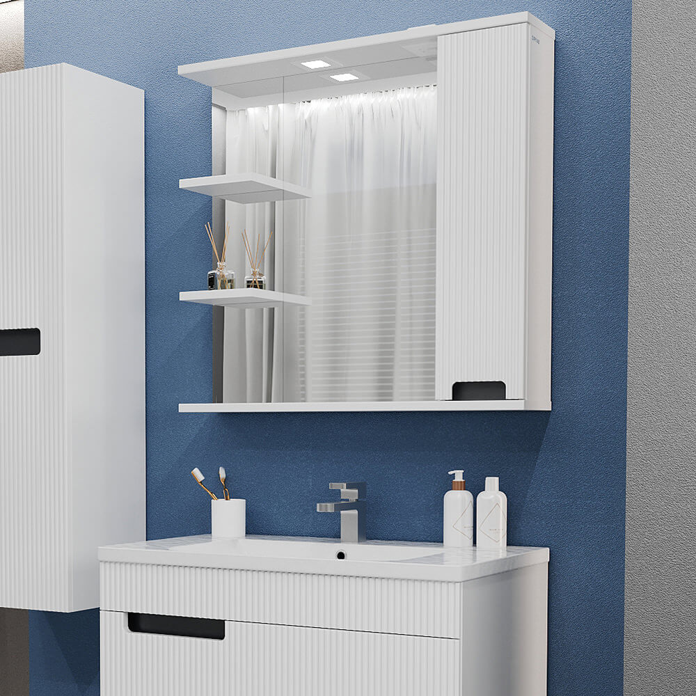 În interior este prevăzut spațiu pentru depozitarea cosmeticelor, produselor de igienă și accesoriilor. Suprafața cu oglindă contribuie la mărirea vizuală a încăperii, iar iluminarea integrată sporește confortul în timpul rutinei de dimineață și seară.