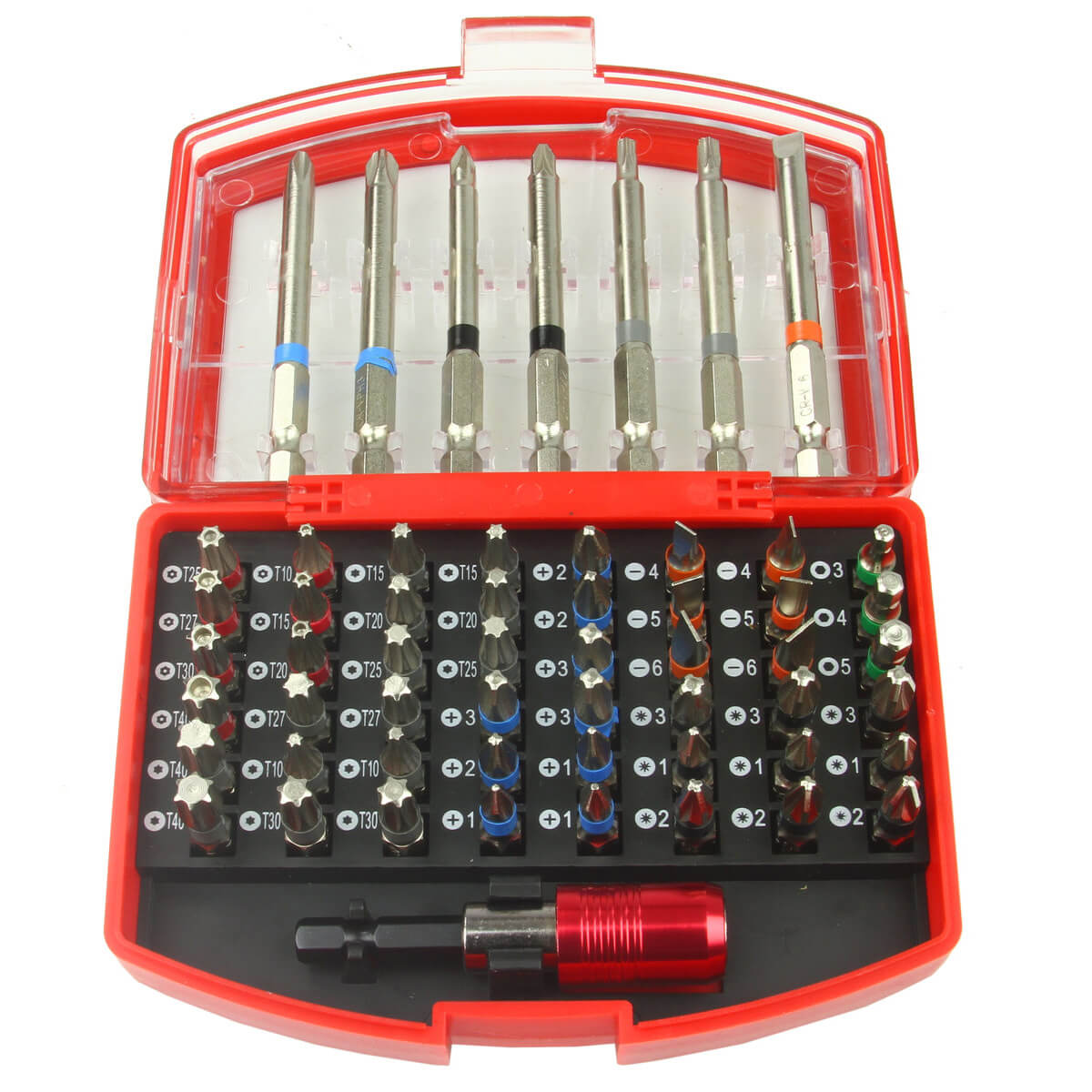 Все насадки аккуратно размещены в удобном пластиковом кейсе с прозрачной крышкой. Каждая бита имеет свое место с маркировкой, что обеспечивает быстрый поиск нужного инструмента и защиту от потери. В комплекте также предусмотрен держатель с магнитным наконечником для надежной фиксации бит.