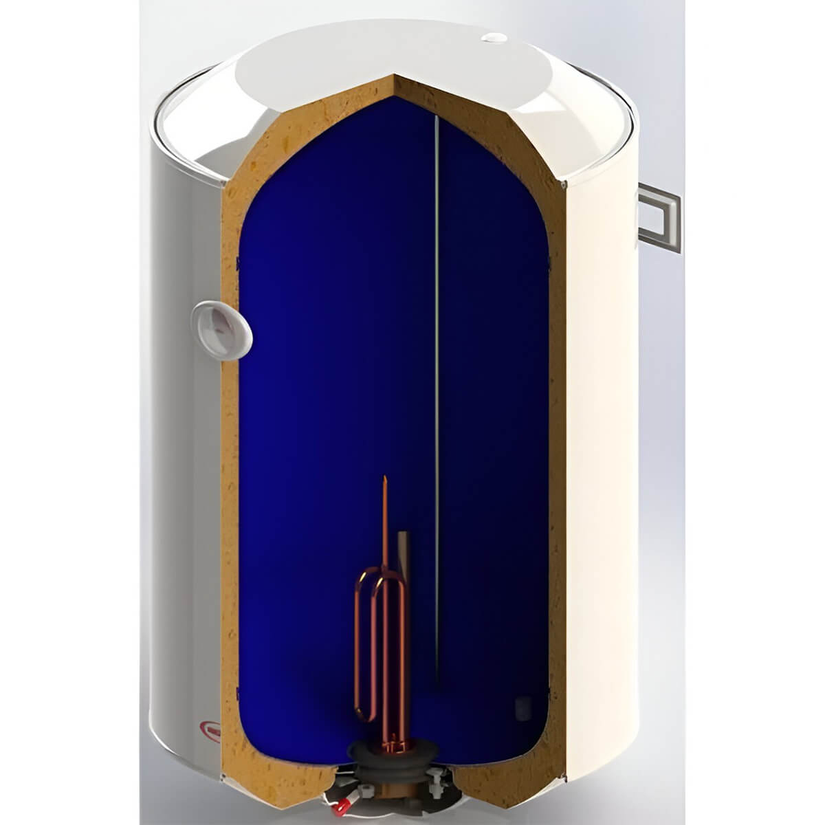 Резервуар объёмом 50 литров изготовлен из прочного металла и покрыт защитной эмалью, устойчивой к перепадам температуры и длительному контакту с водой. Нагрев осуществляется «мокрым» ТЭНом мощностью 1200 Вт, который равномерно прогревает воду и выходит на рабочий режим без лишних энергозатрат. Внутренняя теплоизоляция снижает теплопотери, позволяя дольше сохранять температуру и экономить электроэнергию.
