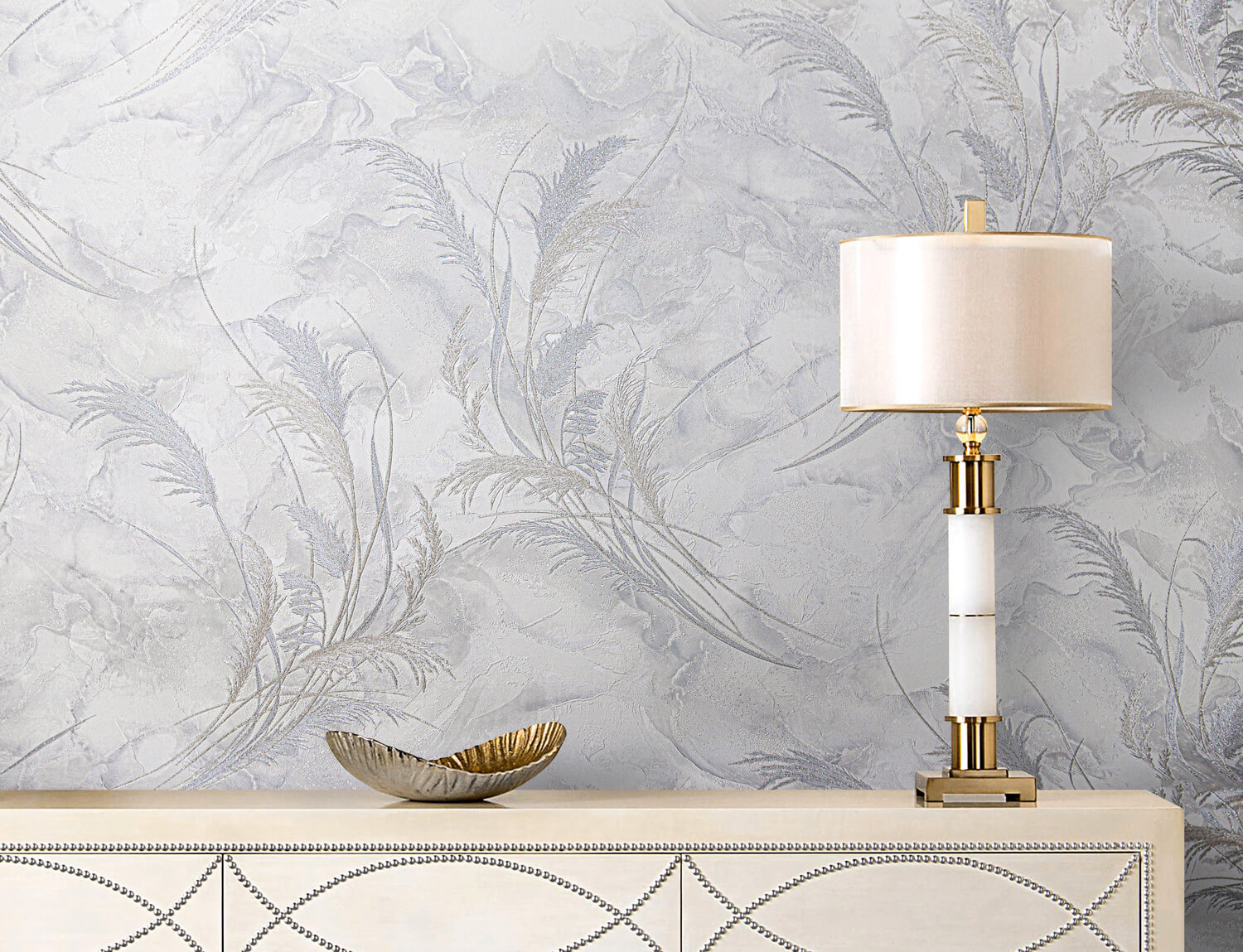 Обои флизелиновые Индустрия ANTURAGE Tenero горячее тиснение (1,06х10 м) AN9040-23 — это спокойный светлый фон с мягкой фактурой «под штукатурку» и изящным растительным рисунком. За счёт технологии горячего тиснения поверхность выглядит объёмной и «живой»: свет деликатно играет на рельефе, а интерьер становится визуально теплее и аккуратнее.