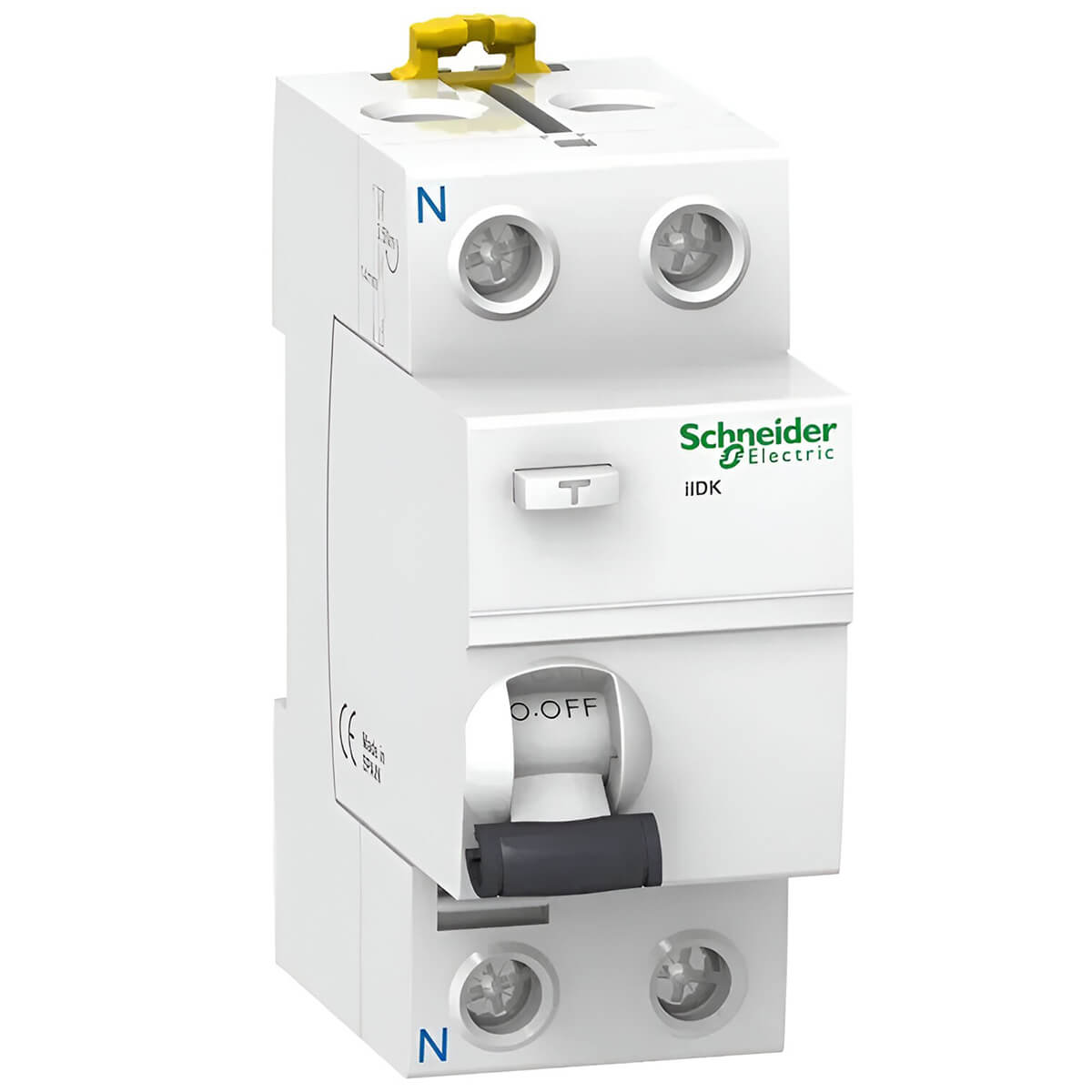 УЗО Schneider Electric Acti 9 iID K 2 P, 40 A, 30 мА, тип AC, DIN-рейка A9R50240 предназначено для защиты людей и электропроводки при появлении тока утечки. Устройство автоматически отключает питание при утечках на корпус, повреждении изоляции или случайном прикосновении, снижая риск поражения электрическим током и возгорания.