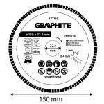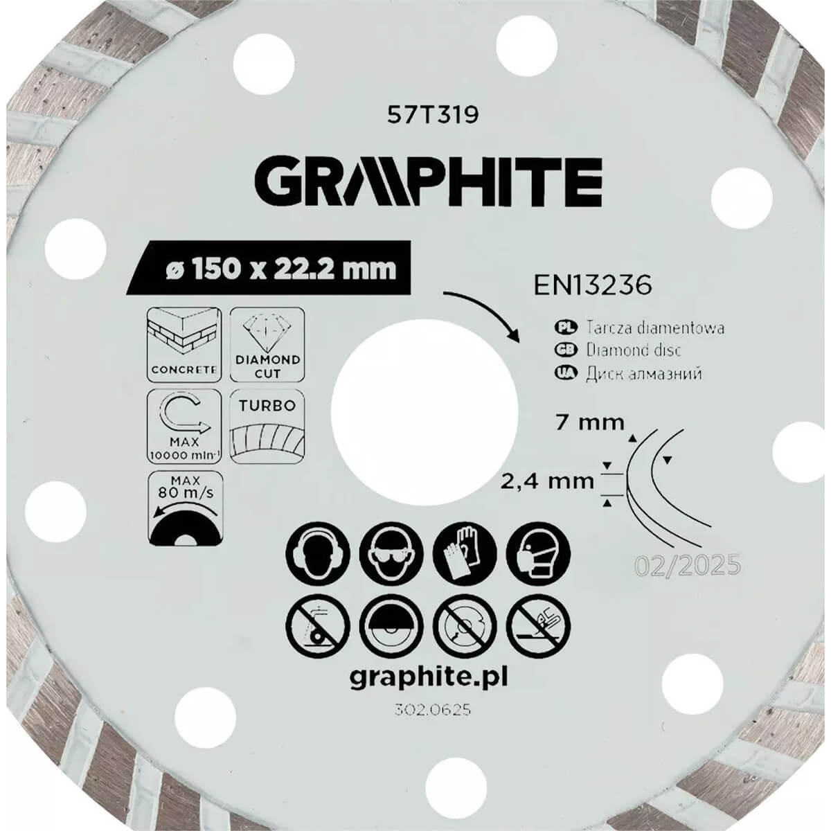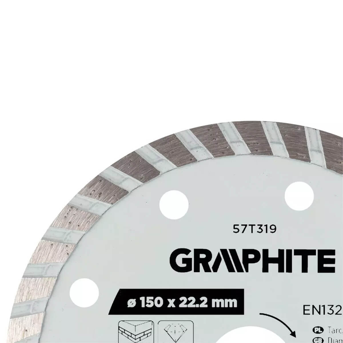 Диск алмазный отрезной Graphite Turbo 150×22,2 мм 57T319 — инструмент для быстрых, чистых резов по твёрдым строительным материалам. Он создан прежде всего для сухого реза, когда нужно работать без воды и без лишних сложностей на объекте. Подходит для бетона, кирпича и натурального камня, то есть для типичных задач на стройке и в ремонте.