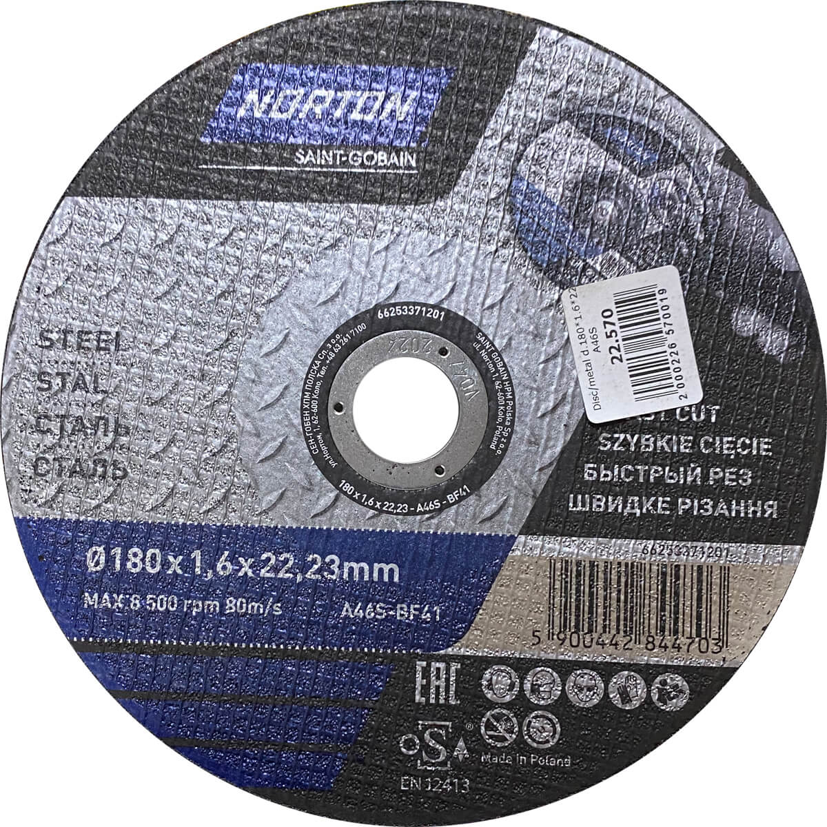 Круг отрезной по металлу 180 х 1,6 х 22,2 мм Norton (66253371201)
