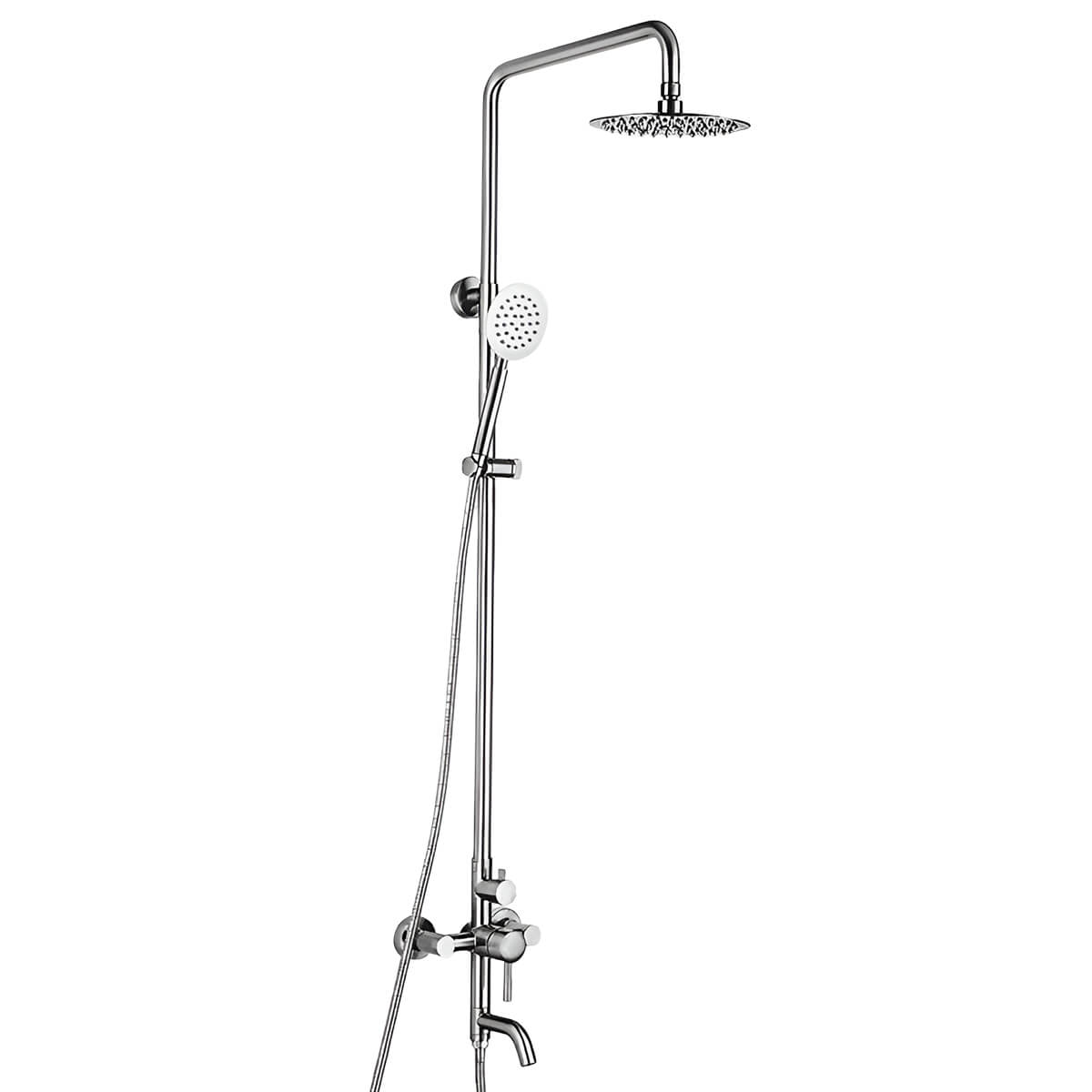 Комплект собран вокруг настенной стойки: верхняя лейка установлена на Г-образном кронштейне, ручная лейка подключается гибким шлангом и фиксируется на держателе, а управление потоком и температурой вынесено на смеситель.