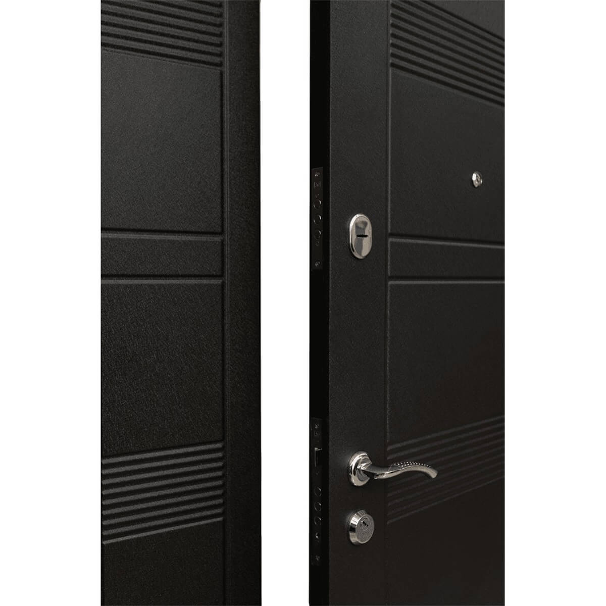 Конструкция двери выполнена из прочного стального полотна толщиной 1,2 мм и усиленной коробки толщиной 1,6 мм, что обеспечивает высокий уровень взломостойкости и долговечности. Модель оснащена двумя замками и глазком, а также антисрезами, которые предотвращают снятие полотна с петель.