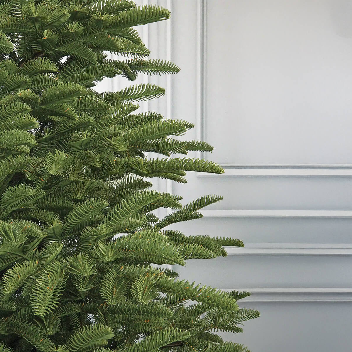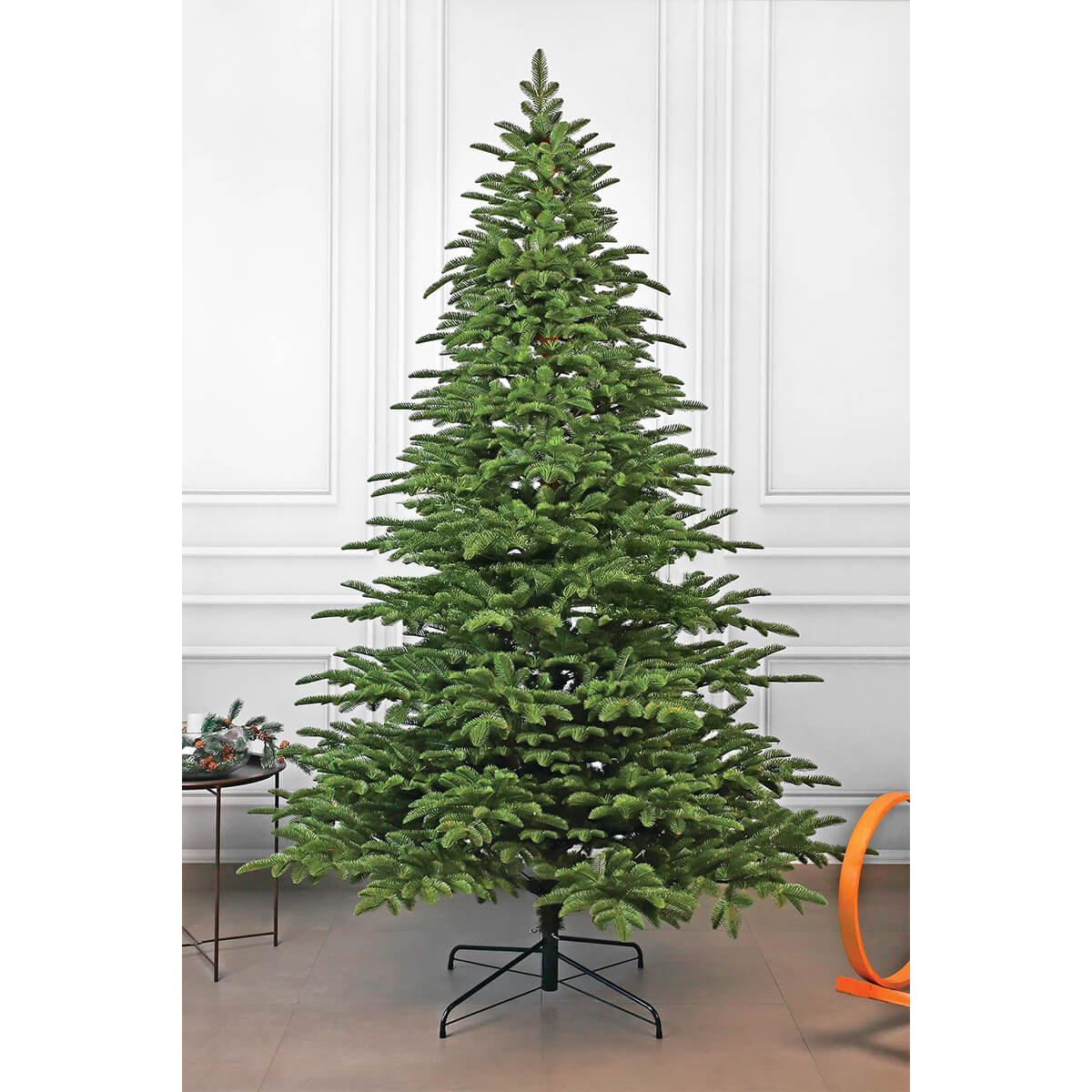 Диаметр кроны 150 см обеспечивает гармоничные пропорции: ёлка смотрится пышно, но не перегружает пространство. Зеленый оттенок хвои максимально приближен к натуральному, без глянцевого блеска и искусственного эффекта.