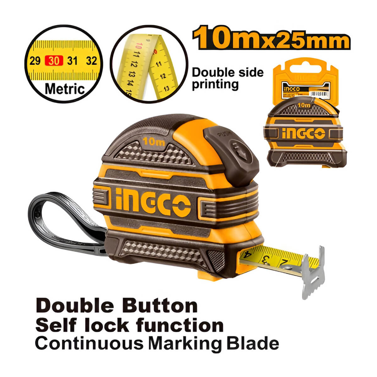 Рулетка INGCO 10 м х 25 мм, автостоп, метрическая шкала HSMT081025-1 — применяется для точных замеров при строительных, ремонтных и отделочных работах. Корпус выполнен из прочного пластика с противоскользящими вставками, что обеспечивает комфорт и безопасность при использовании даже в перчатках.