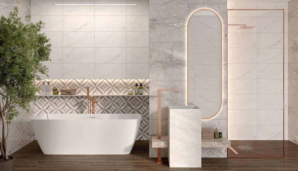 Формат 297х600 мм удобен для облицовки стен: плитка выглядит цельно, помогает создать ровную раскладку и хорошо сочетается как с однотонными материалами, так и с декоративными вставками. Серый цвет считается универсальным, поэтому его легко комбинировать с белой сантехникой, черной фурнитурой, древесными текстурами и металлическими акцентами.