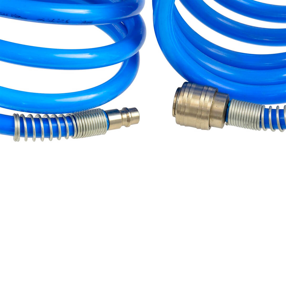 Шланг выполнен из полиэтилена (PE), рассчитан на давление до 7 бар и подходит для стабильной подачи воздуха при повседневных работах: продувка, накачка, работа с пистолетом для обдува и другим пневмоинструментом. На концах установлены поворотные соединения и защитные пружины, которые уменьшают риск перелома шланга в местах изгиба.