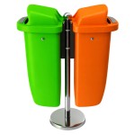 Урна уличная двойная для раздельного сбора мусора, 2х50 л, на стойке, пластик, зелёная и оранжевая, 440х720х930 мм - предназначена для удобного разделения отходов в общественных местах: у входов в здания, на территориях предприятий, в парках, дворах и на остановках. Два отдельных контейнера помогают поддерживать порядок и упрощают сортировку.