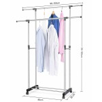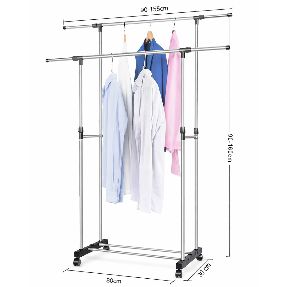 Стойка для одежды на колёсиках двойная регулируемая 90-155 см, высота 90-160 см, 80x30 см AT3123/TM0083 — напольная вешалка для хранения и сушки одежды с двумя перекладинами. Подойдёт для квартиры, гардеробной, магазина, шоурума или как временный «дополнительный шкаф», когда вещей стало больше, чем полок.