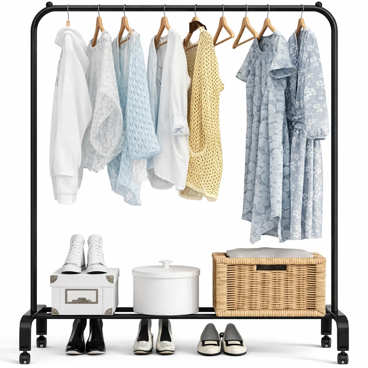 Стойка для одежды напольная 110x41x150 см, металл, чёрная, на колёсах, с полкой для обуви, RKJ112B