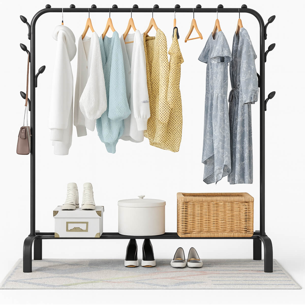 Прочная металлическая рама выдерживает ежедневное использование, а устойчивое основание обеспечивает надёжность даже при полной загрузке. Нижняя полка предназначена для обуви, коробок или корзин, а боковые крючки позволяют удобно разместить сумки, головные уборы и шарфы.