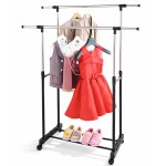 Стойка напольная для одежды двойная на колесах с полкой 900-1500 x 430 x 1000-1600 мм AT3124/TM0072 — удобное решение для хранения и развешивания вещей дома, в гардеробной, магазине или на складе. Две перекладины помогают разделить одежду по типам, а нижняя полка подходит для обуви или коробок.