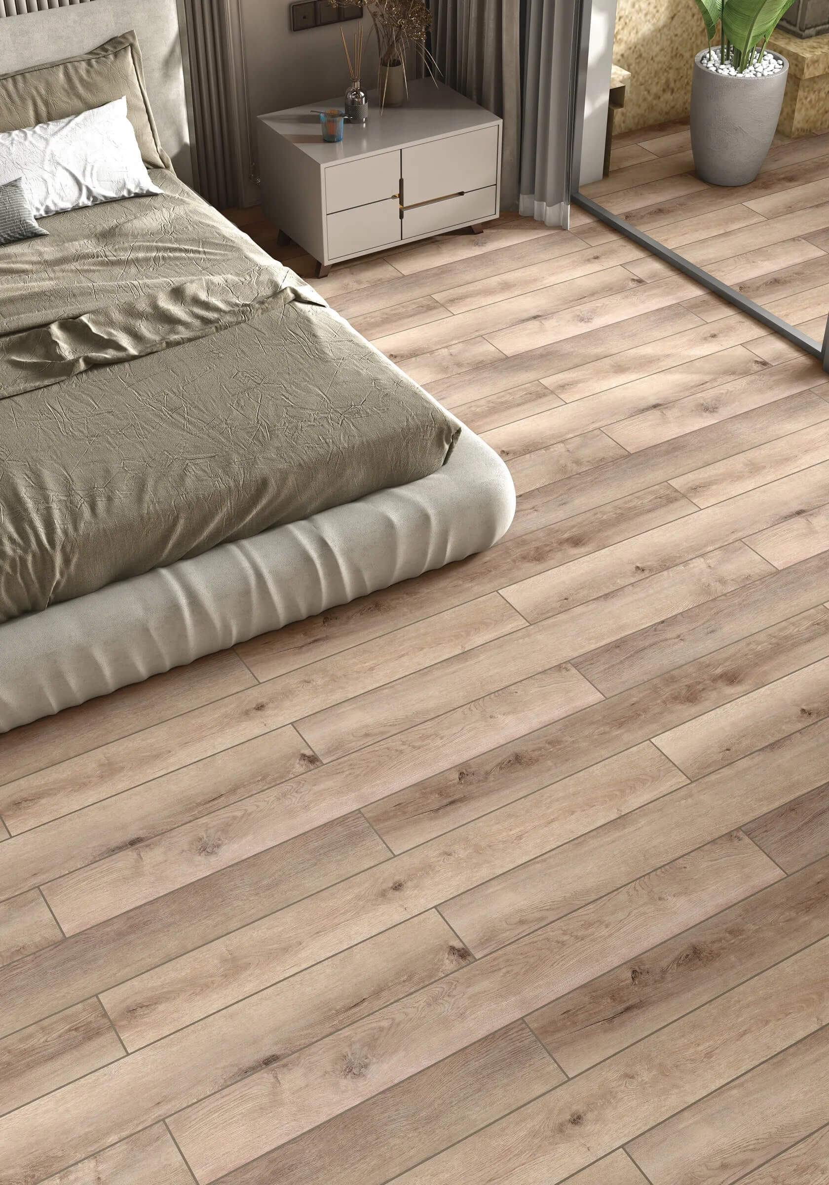 Благодаря толщине 5 мм, классу 33 и наличию фаски, покрытие уверенно выдерживает нагрузки в доме и коммерческих пространствах. Декор в тёплой натуральной гамме делает интерьер визуально уютным, а матовая поверхность подчёркивает фактуру древесины.