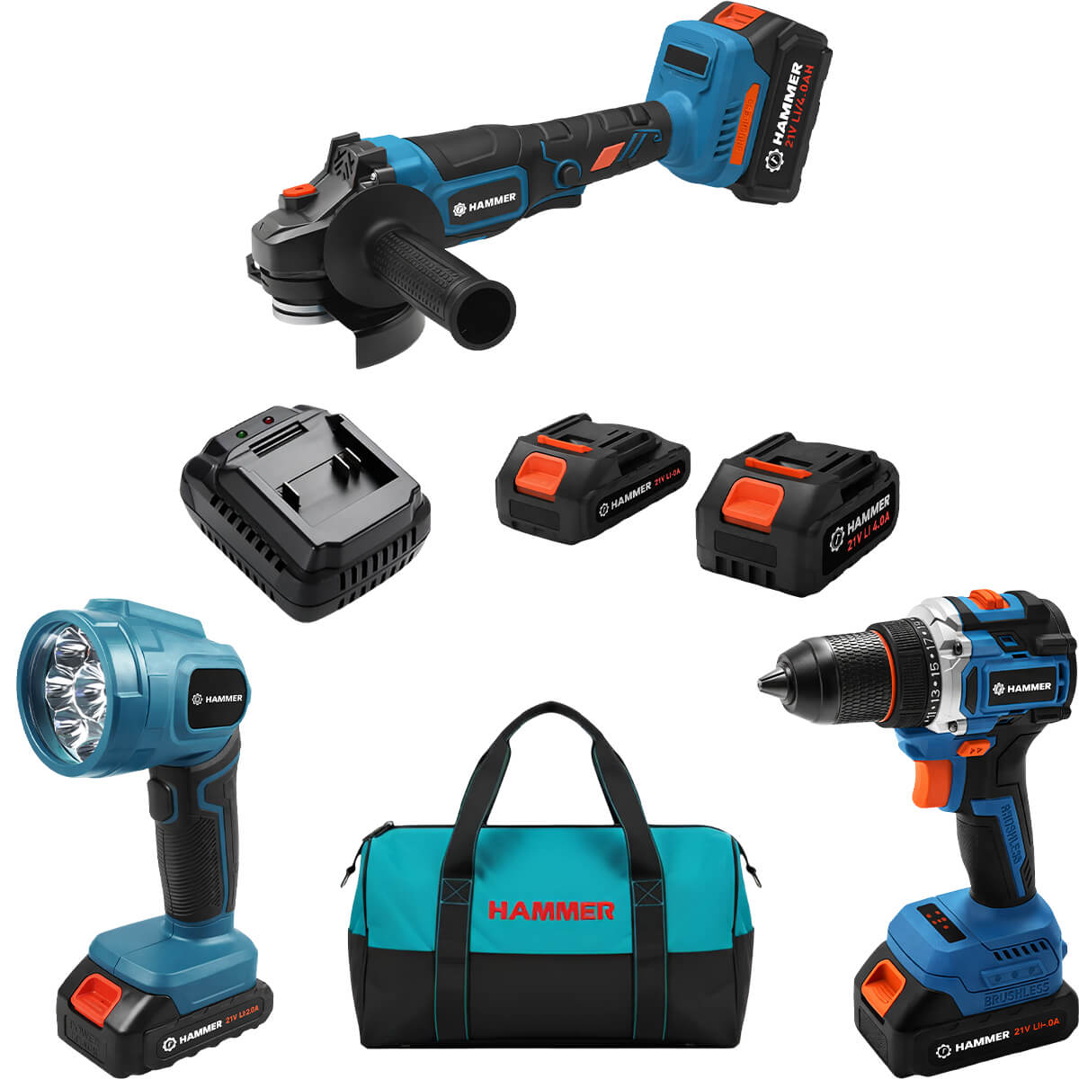 Набор аккумуляторного инструмента Hammer УШМ (болгарка), дрель-шуруповёрт, LED-фонарь, 21 В, 2 АКБ Li-Ion 4,0 Ач + 2,0 Ач (Арт. 40920) — универсальное решение для тех, кто хочет закрыть основные рабочие задачи одним комплектом. Подходит для ремонта, монтажа, сборки и обслуживания без привязки к розетке.