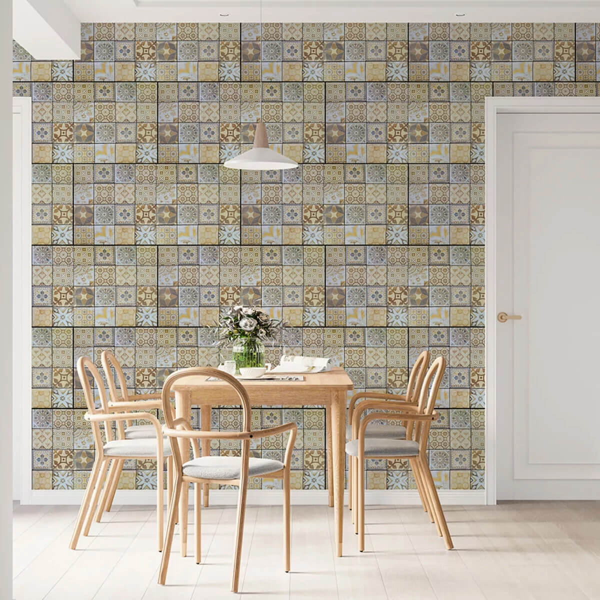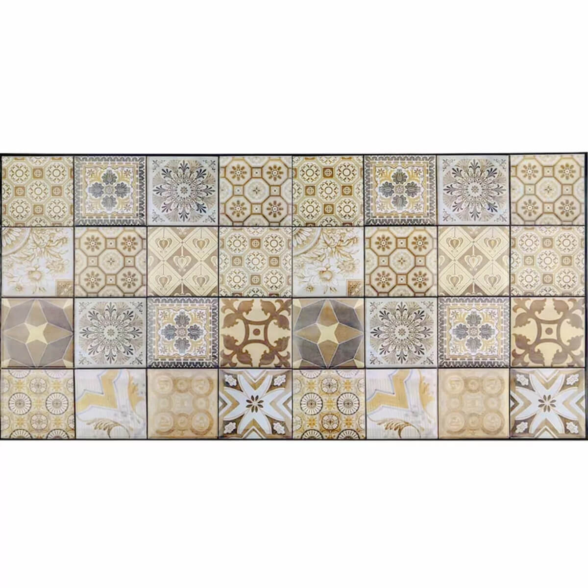 Поверхность панели имитирует плитку в стиле «пэчворк» с мягкими бежевыми оттенками, создавая уютную и гармоничную атмосферу в интерьере. Благодаря глянцевому покрытию достигается эффект глубины и лёгкий 3D-объем.