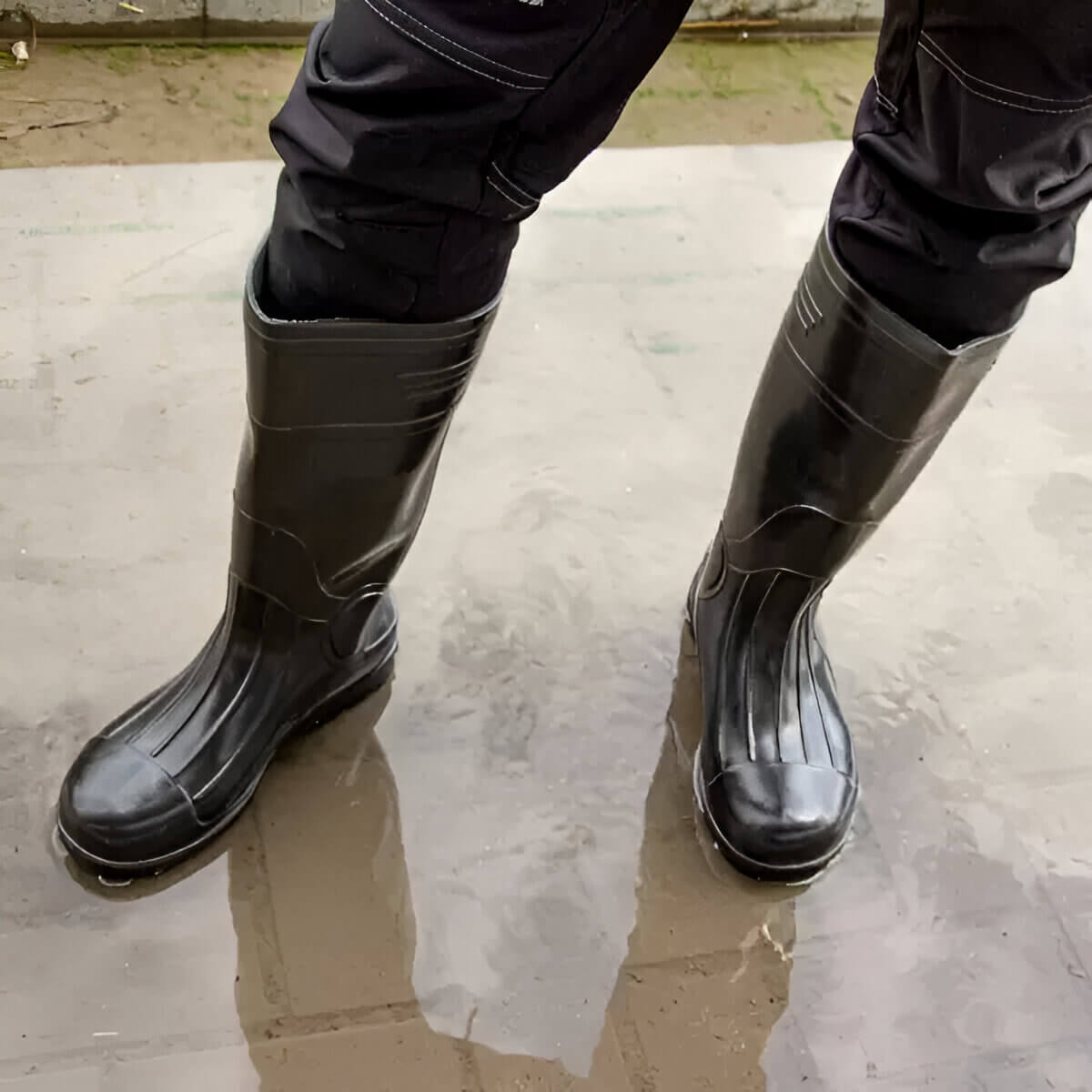 Сапоги имеют высокую голень, что формирует дополнительный барьер от воды и обеспечивает уверенность при работе на неровных и влажных участках. Подошва выполнена из долговечного материала с выраженным протектором — он снижает риск скольжения и помогает сохранять стабильность даже на размокшем грунте.