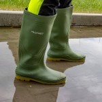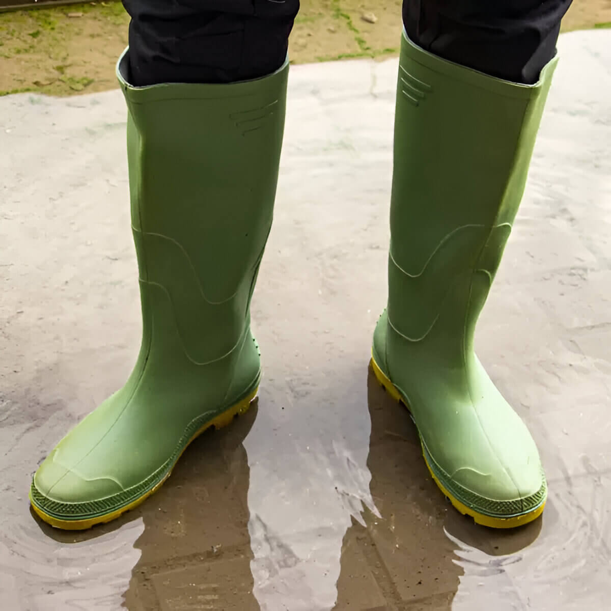 Сапоги имеют высокую голень, что формирует дополнительный барьер от воды и обеспечивает уверенность при работе на неровных и влажных участках. Подошва выполнена из долговечного материала с выраженным протектором — он снижает риск скольжения и помогает сохранять стабильность даже на размокшем грунте.