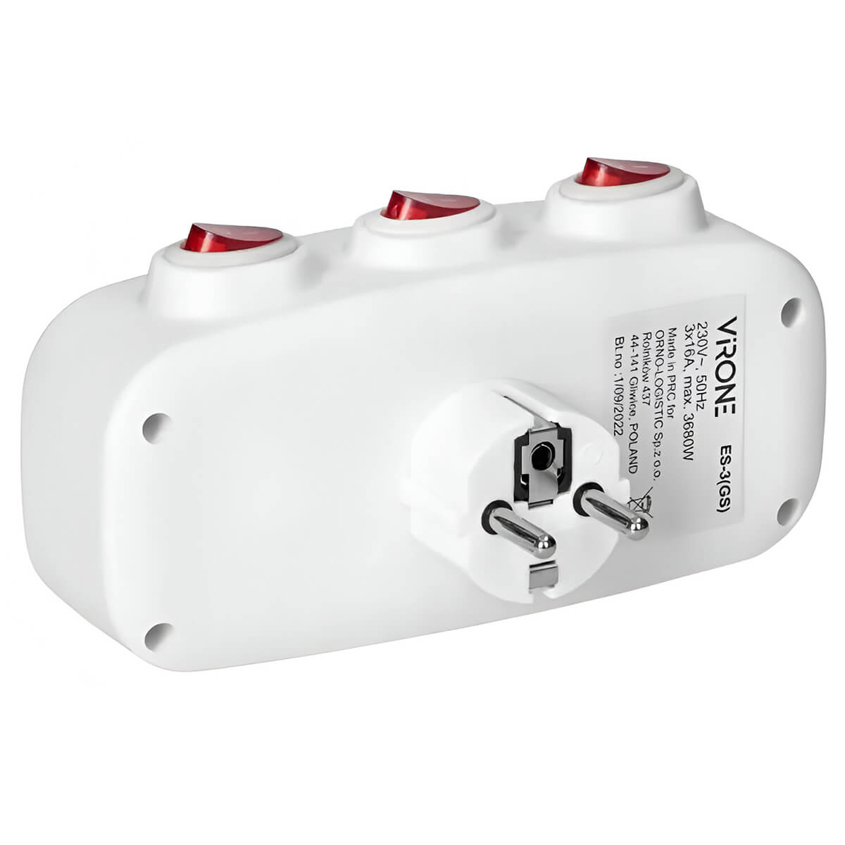 Разветвитель сетевой ORNO Virone ES3GS 3 розетки с индивидуальными выключателями, 16 А, IP20, белый — предназначен для подключения нескольких электрических приборов в одном месте. Каждая розетка оснащена отдельным выключателем с подсветкой, что позволяет независимо управлять питанием подключённых устройств.