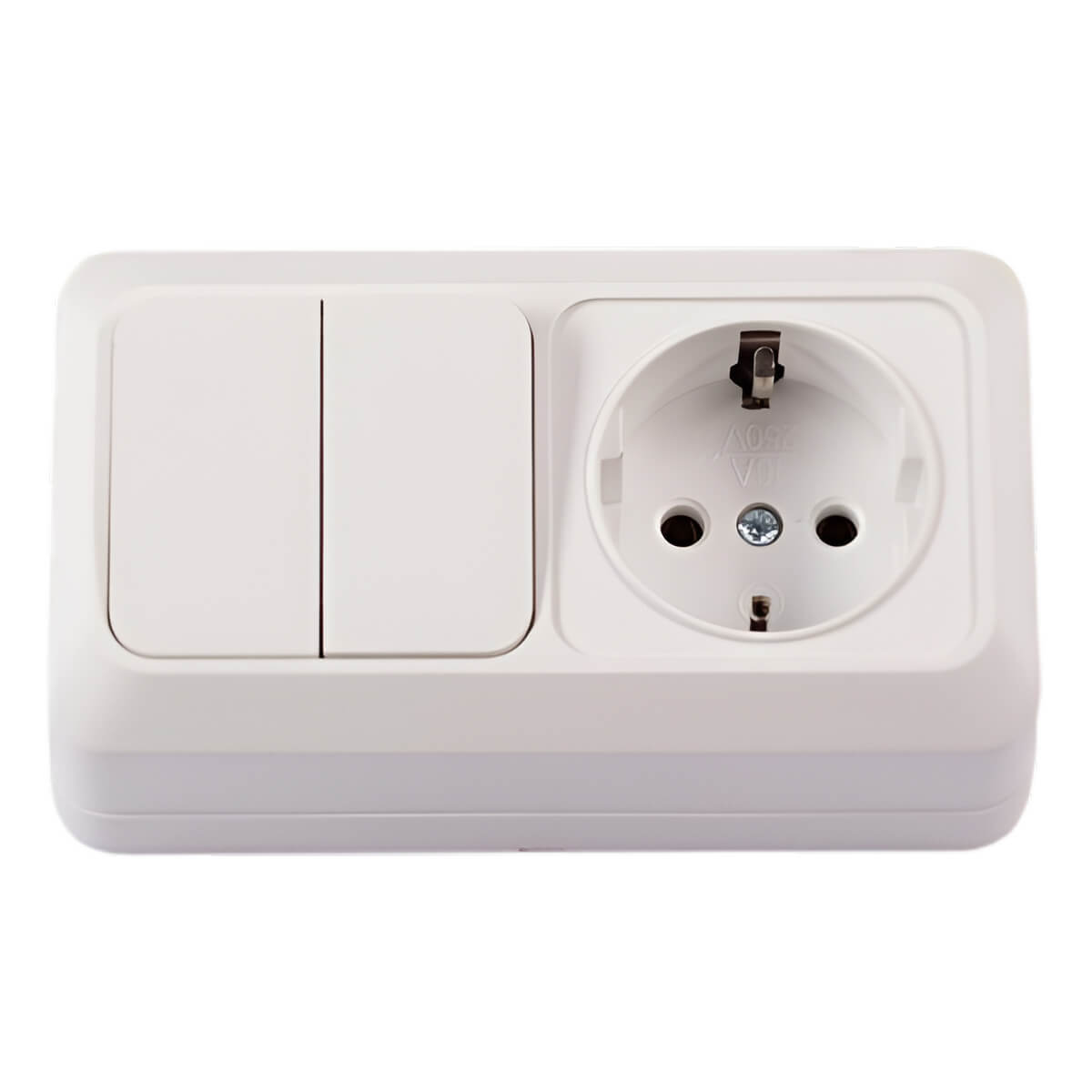 Выключатель с розеткой накладной двухклавишный с заземлением 1000kW VENUS 16 А, 250 В, IP20, белый — предназначен для подключения осветительного прибора и бытовой техники в одной точке. Конструкция рассчитана на накладной монтаж по стене без штробления, что удобно при ремонте, в подсобных помещениях, на дачах и в гаражах.