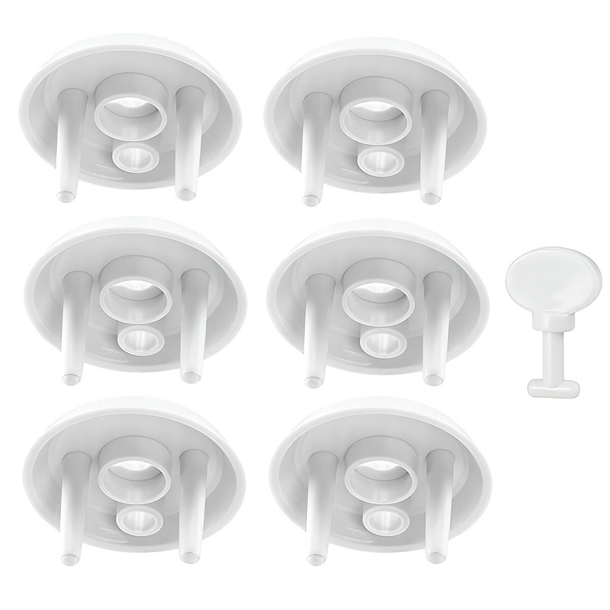 Насадки подходят для розеток с заземлением и без заземления французского стандарта (тип E). Белый цвет делает заглушки малозаметными на стене и не нарушает внешний вид интерьера. Комплект из 6 штук удобен для защиты сразу нескольких розеток в детской комнате, гостиной или других помещениях.