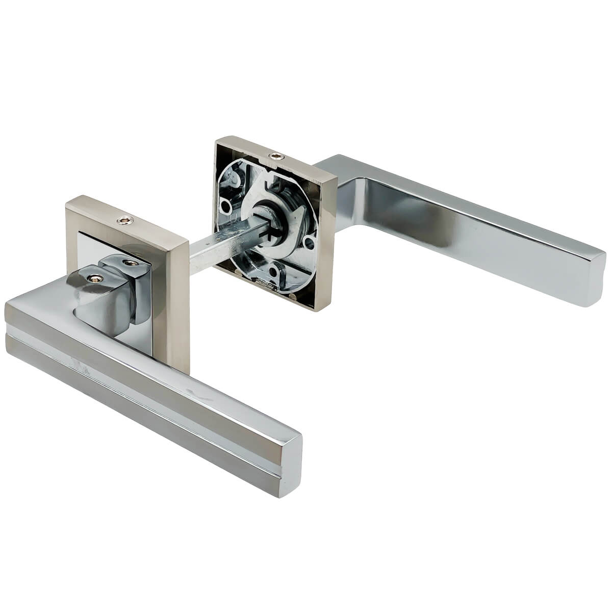 Дверная ручка на розетке MPN SN/CP (сатин/хром) для межкомнатных дверей SKT-L413 — это комплект нажимных ручек для открывания и закрывания межкомнатных дверей. Подходит для установки на дверное полотно с замком под квадратный шпиндель. Комбинация отделки сатин/хром выглядит аккуратно и легко сочетается с современной фурнитурой.