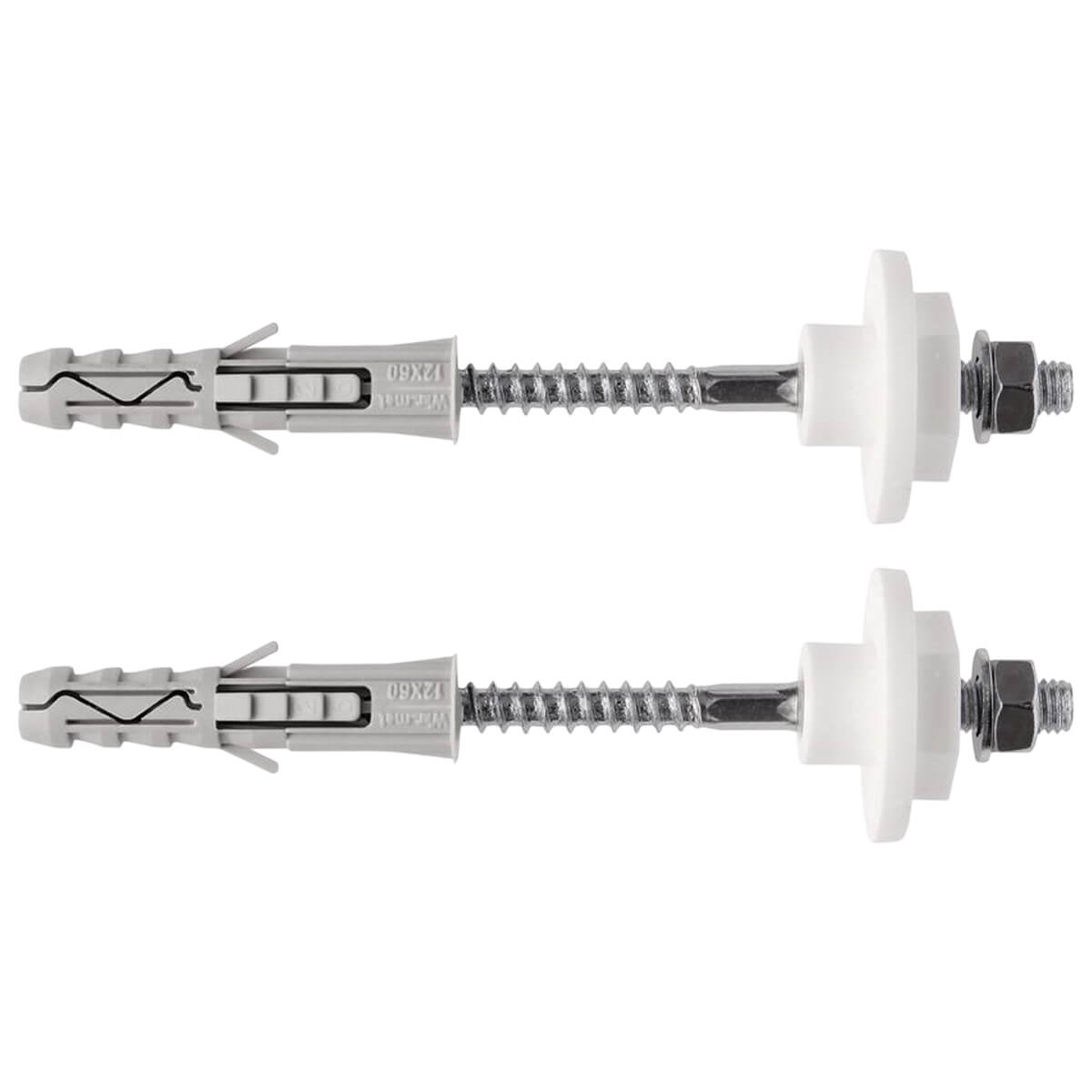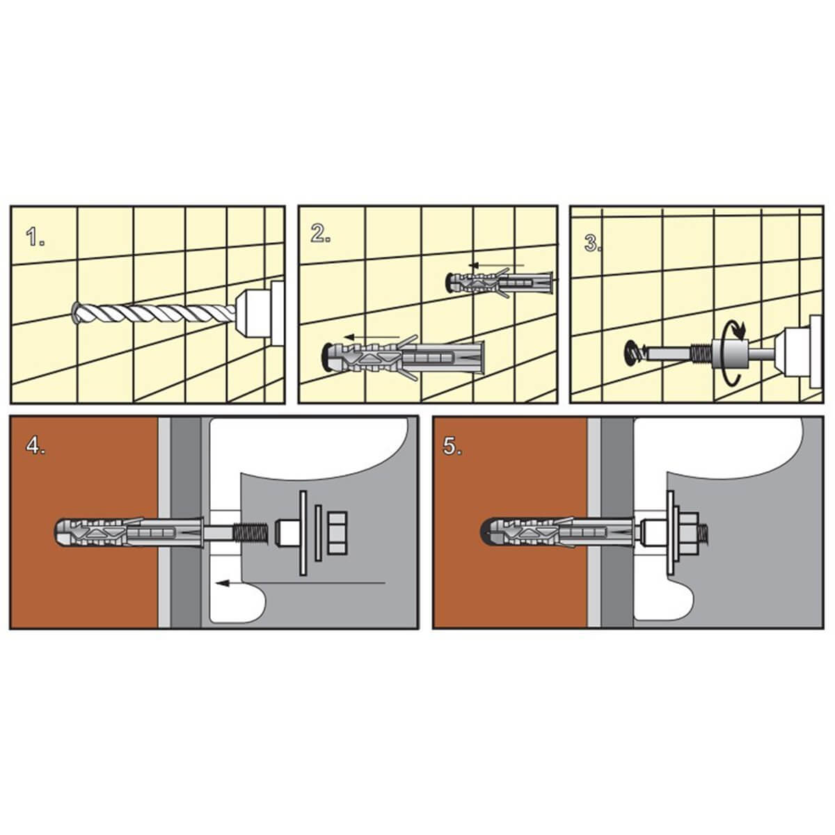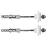 В комплект входит усиленный полиамидный дюбель и стальная оцинкованная шпилька, уже укомплектованная шайбой и гайкой. Такой тандем работает как единая система: дюбель плотно распирается в отверстии, а резьбовая шпилька удерживает раковину даже при интенсивной эксплуатации.