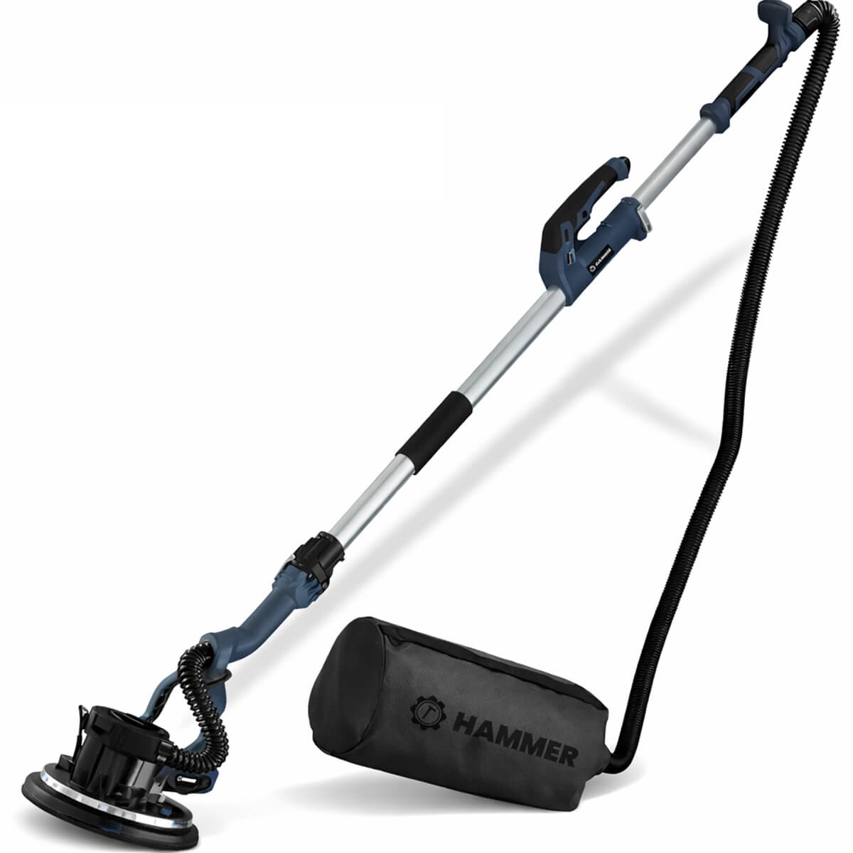 Шлифмашина для стен и потолков HAMMER для гипсокартона d.225 мм, 1200 Вт, 2100 об/мин, телескопическая — удобный инструмент для выравнивания шпаклёвки и подготовки поверхностей под покраску или обои. Телескопическая штанга помогает работать на высоте до 1,8 м, а встроенная LED-подсветка делает заметными неровности и переходы.