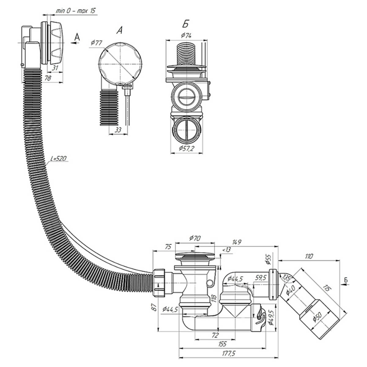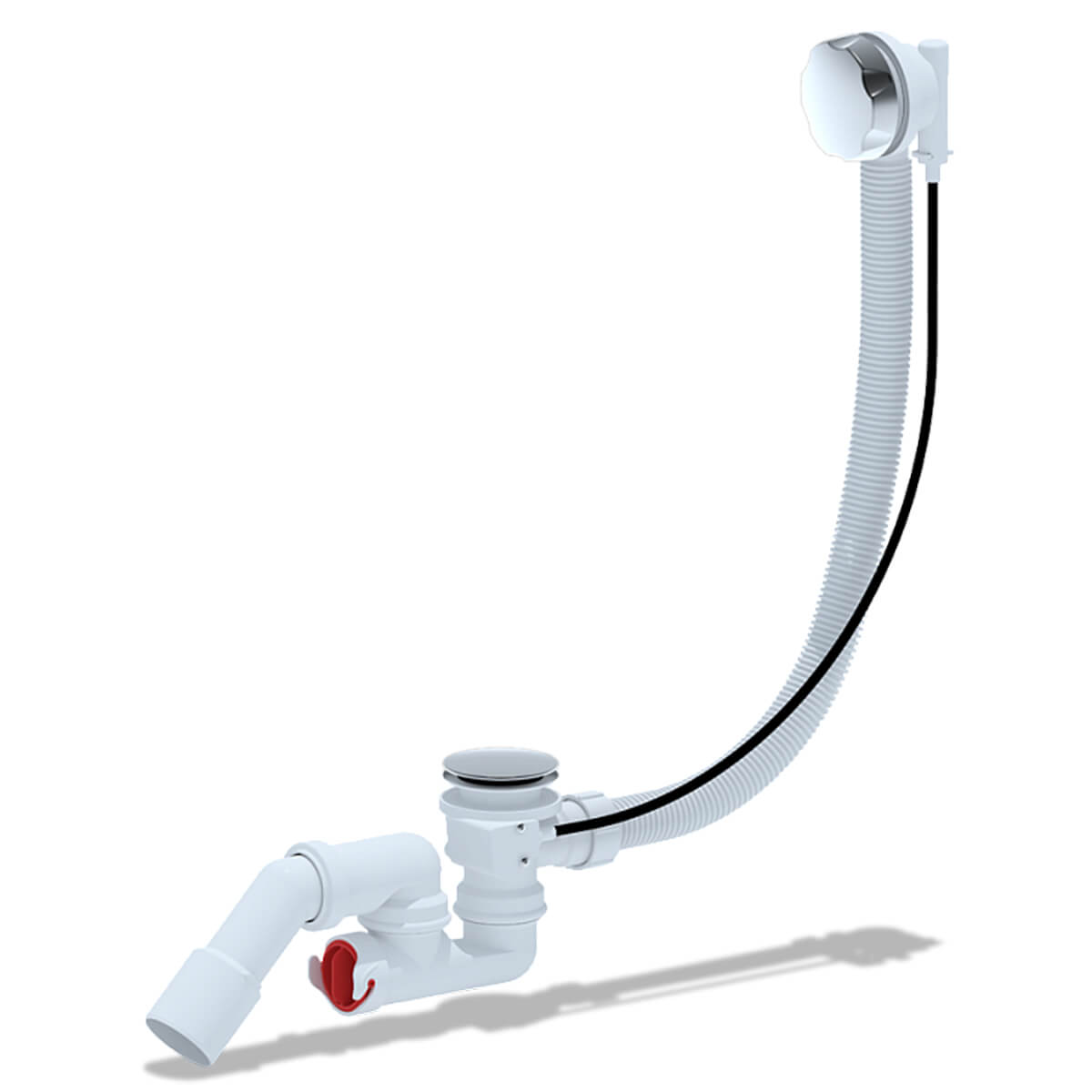 Модель рассчитана на монтаж в стандартные ванны и помогает аккуратно подключить слив к канализации: предусмотрен регулируемый по высоте сифон и переход 45° с подключением 40×50 мм. Длина троса управления — 580 мм, декоративная часть выполнена в хроме.