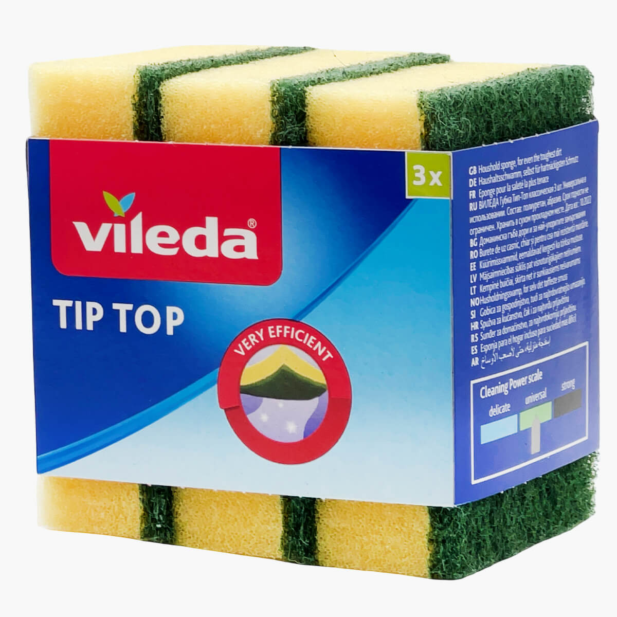 Губки для мытья посуды Vileda Tip Top 7х9 см, абразивные, 3 шт предназначены для ежедневной мойки посуды и кухонных поверхностей. Мягкая часть хорошо вспенивает средство и собирает загрязнения, а абразивный слой помогает быстрее убрать присохшие остатки еды.