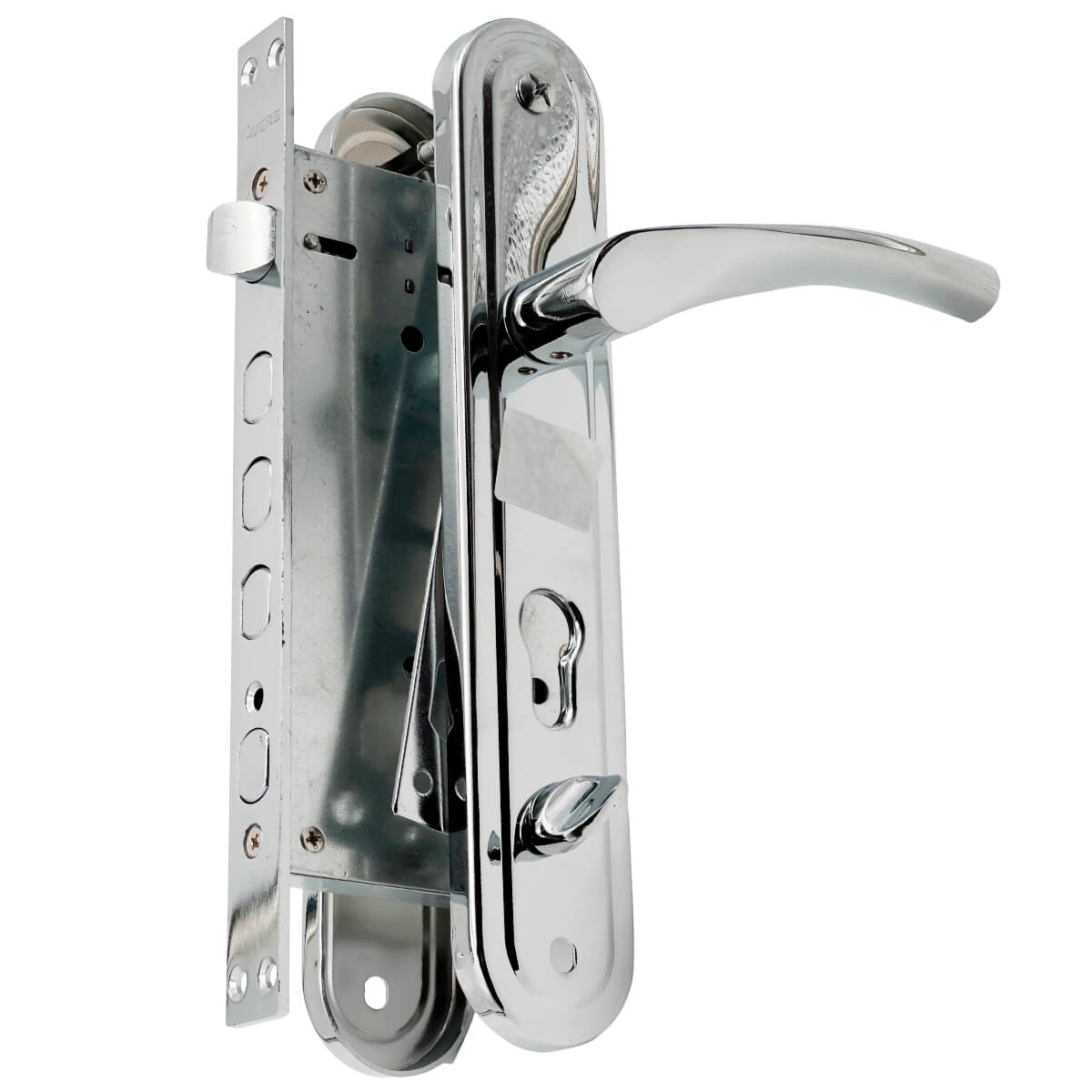За прочность запирания отвечают три цилиндрических ригеля диаметром 18 мм с вылетом 24 мм, которые надёжно фиксируют дверь в закрытом положении. Дополнительно предусмотрена классическая защёлка неуниверсального типа — левосторонняя ориентация замка чётко определяет сторону установки.