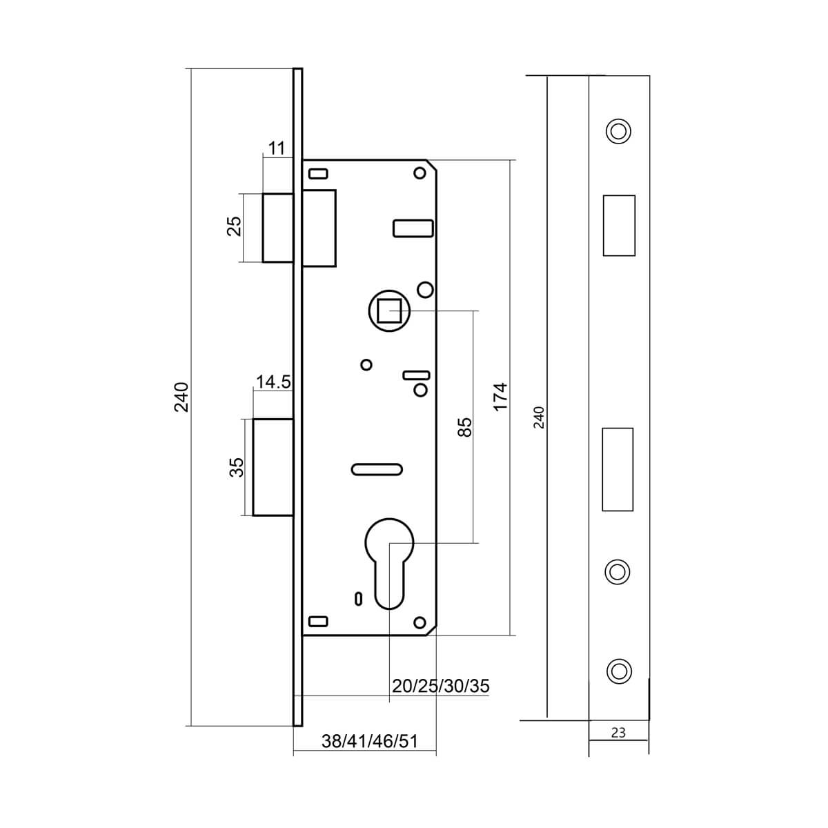 Замок врезной узкопрофильный для алюминиевых дверей PROFMET 174×41×14 мм, под цилиндр, backset 25 мм, межосевое 85 мм — это практичное решение для входных и межкомнатных систем из алюминиевого профиля. Механизм рассчитан на стабильную ежедневную эксплуатацию и обеспечивает плавную работу ручки и надежное фиксирование двери.