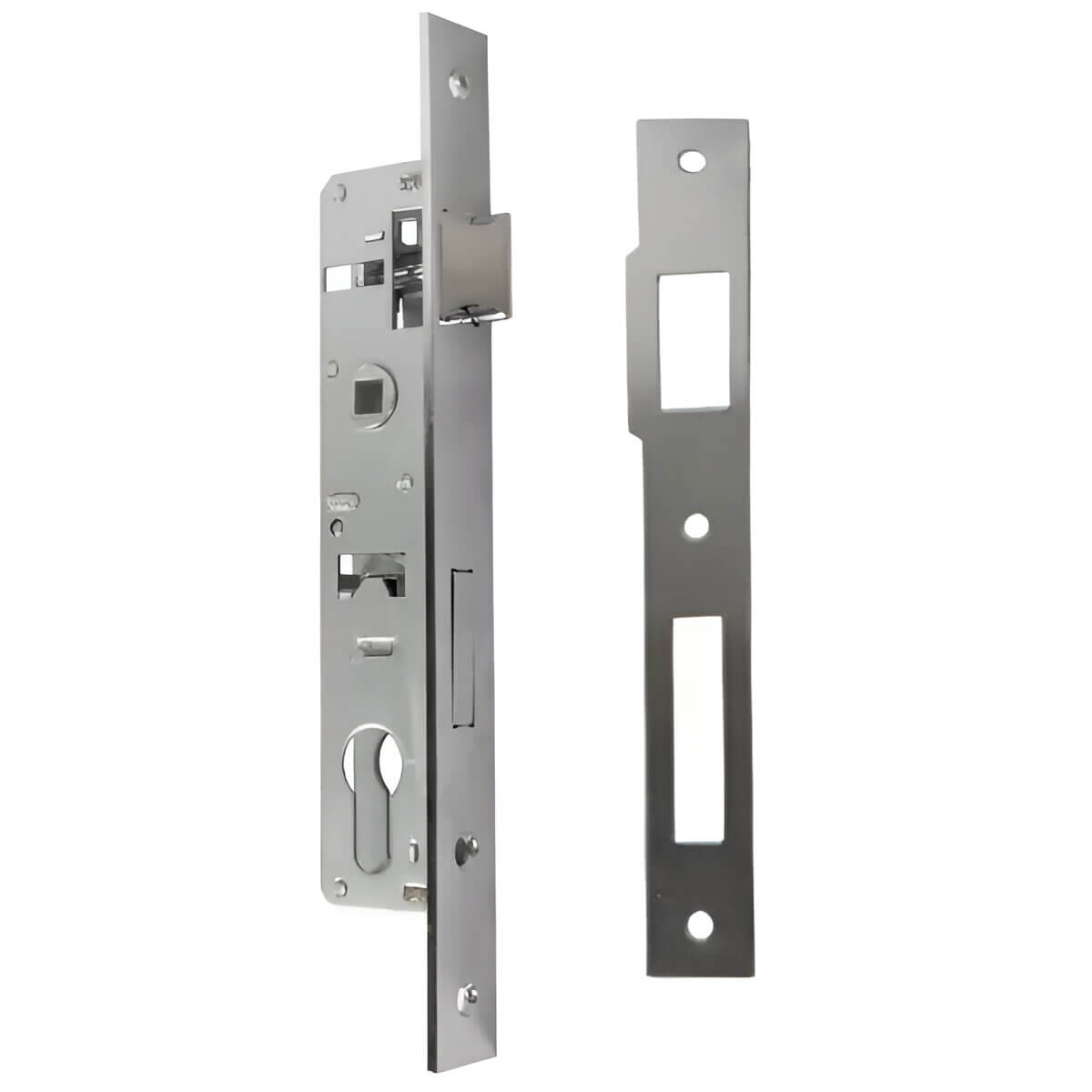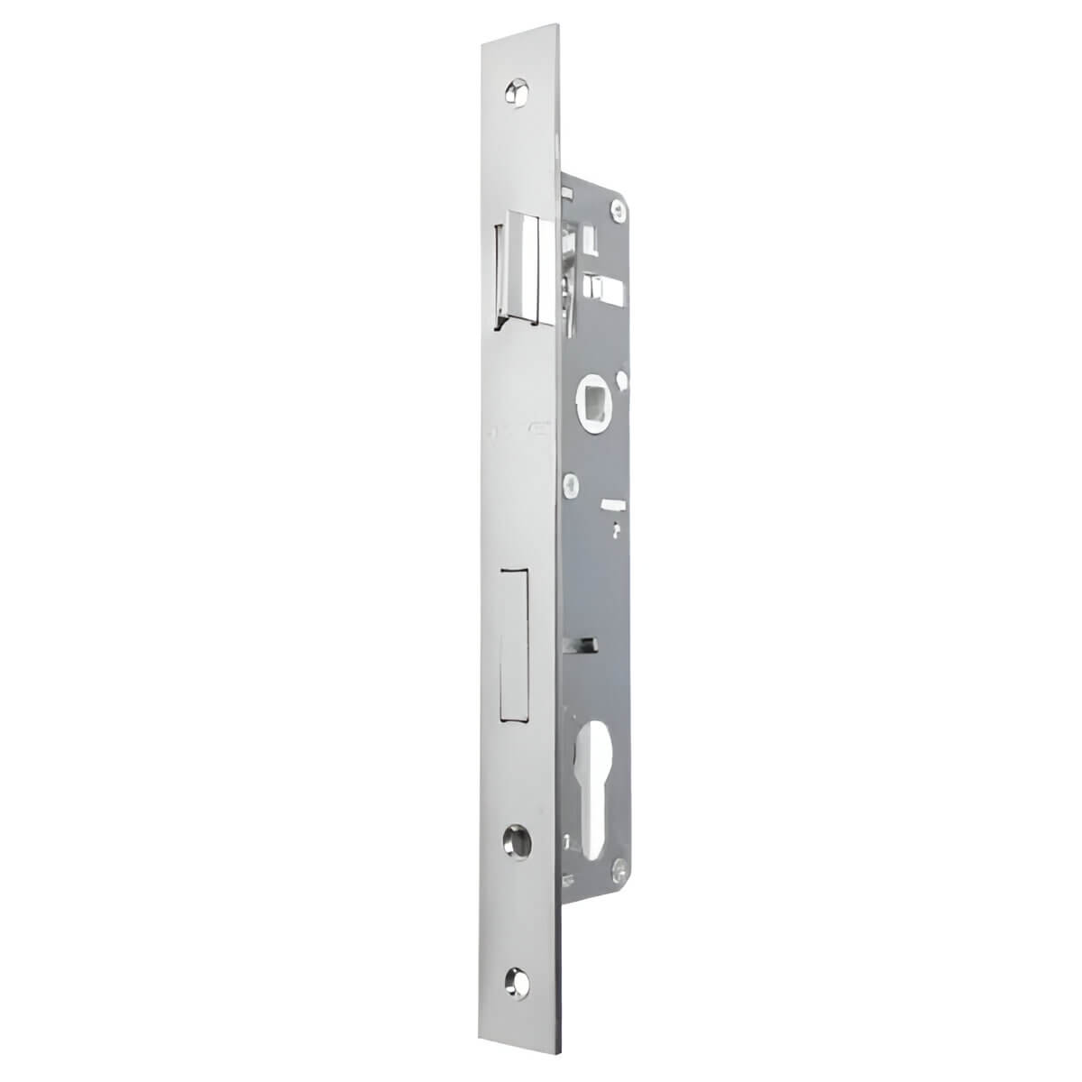 Корпус выполнен из прочного металла, а гальваническое покрытие защищает его от коррозии и износа. Конструкция продумана так, чтобы замок легко устанавливался в узкий профиль и не требовал сложной подгонки. Стандартное межосевое расстояние 85 мм делает его совместимым с большинством цилиндров и фурнитуры.